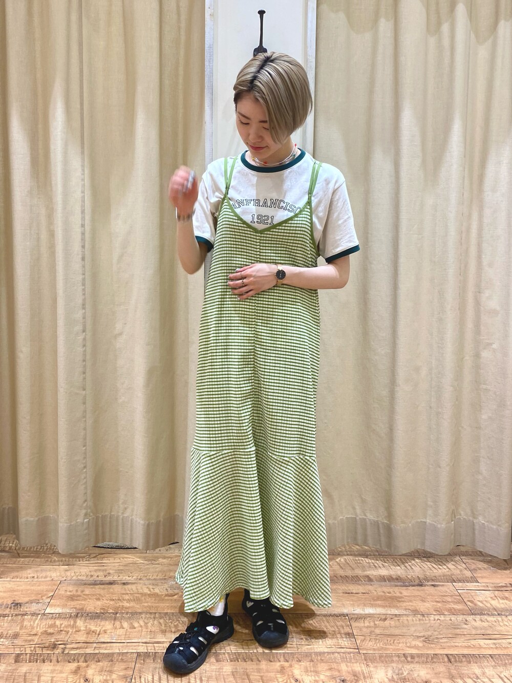 Akiのワンピース「シャーリングチェックキャミワンピース」を使ったコーディネート