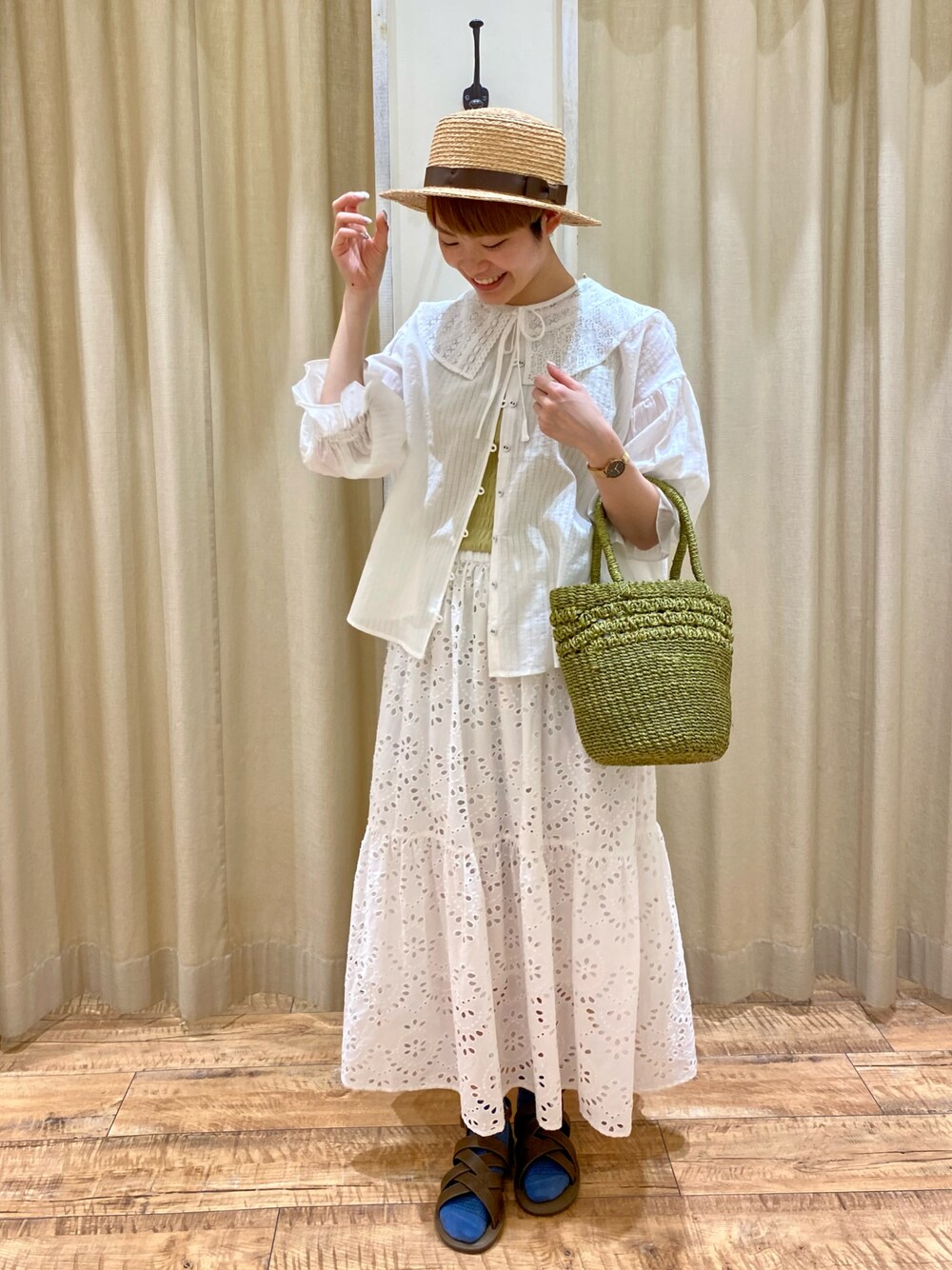 ホワイトコーデに差し色で黄色を入れてみました🌻✨ 長袖のブラウスは薄手なので風通しよく 真夏の日差し対策にも重宝間違いなしです👒🍃