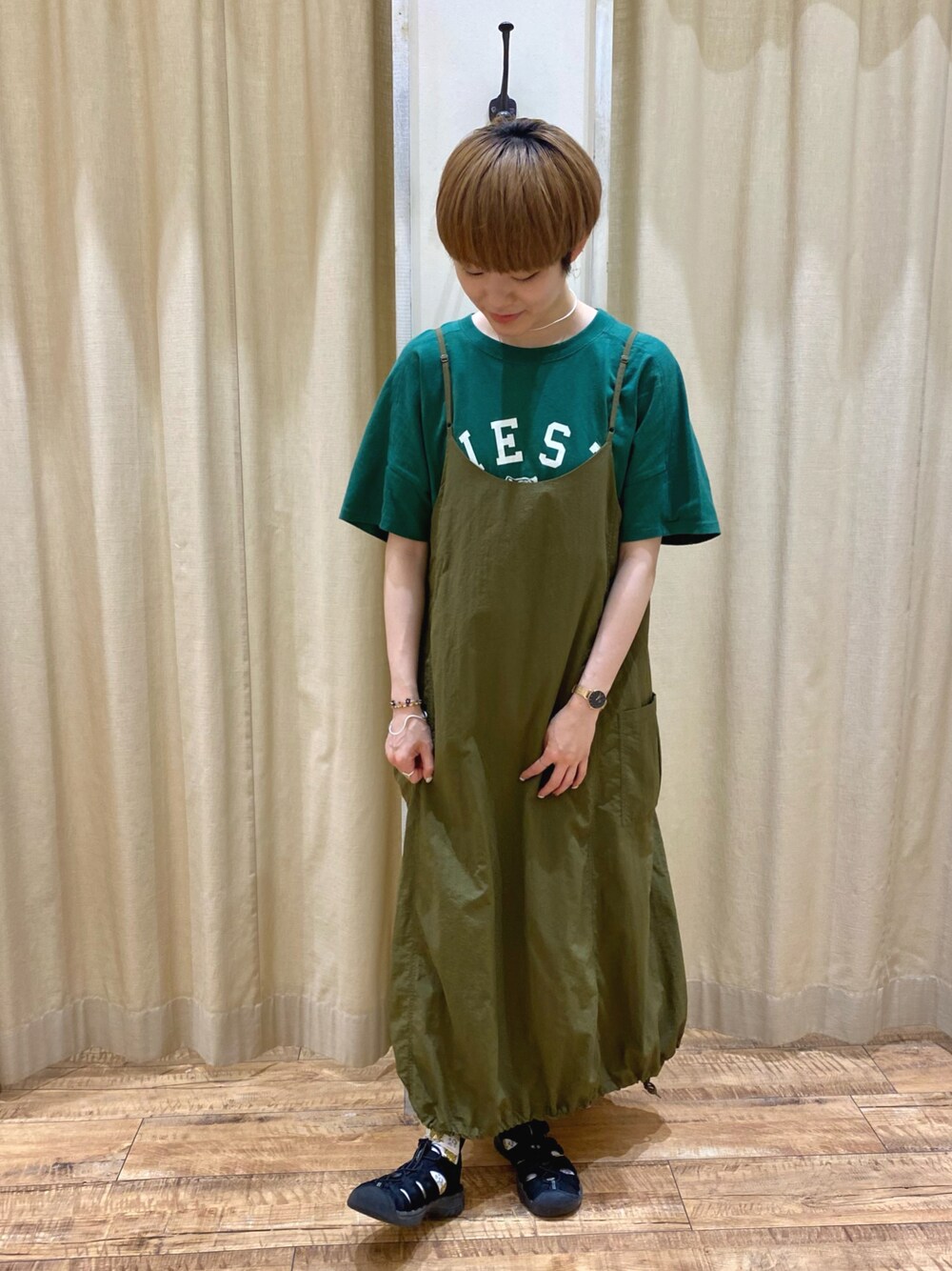 カーキ✖️グリーンで統一感のある色合わせるにしてみました! カーゴキャミワンピは裾を絞って着ると バルーンぽい形になるのでオススメです🎈✨