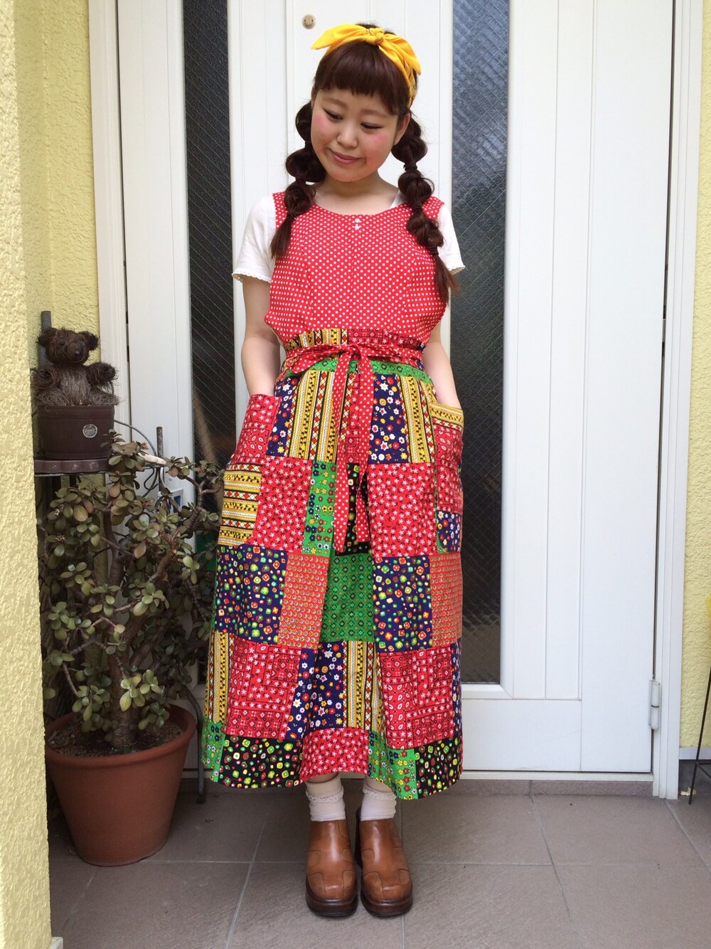♩ パッチワークエプロンワンピ♡ きょうは派手派手にいきました! ここまでくると完全に 自己満足の世界です(笑) これでスーパーに行ったら ちびっこにずーっと見つめられました(笑) 得体の知れない物体だと 思われたのかな…😂😂(笑) そしてフォロワーさんが とっても増えていて びっくり&とっても嬉しい♡ コテコテ古着なのに 大丈夫なんでしょうか…😖(笑) さて今日のコーデ! ワンピ、靴:Fizz 靴下、Tシャツ:ノーブランド バンダナ:USED