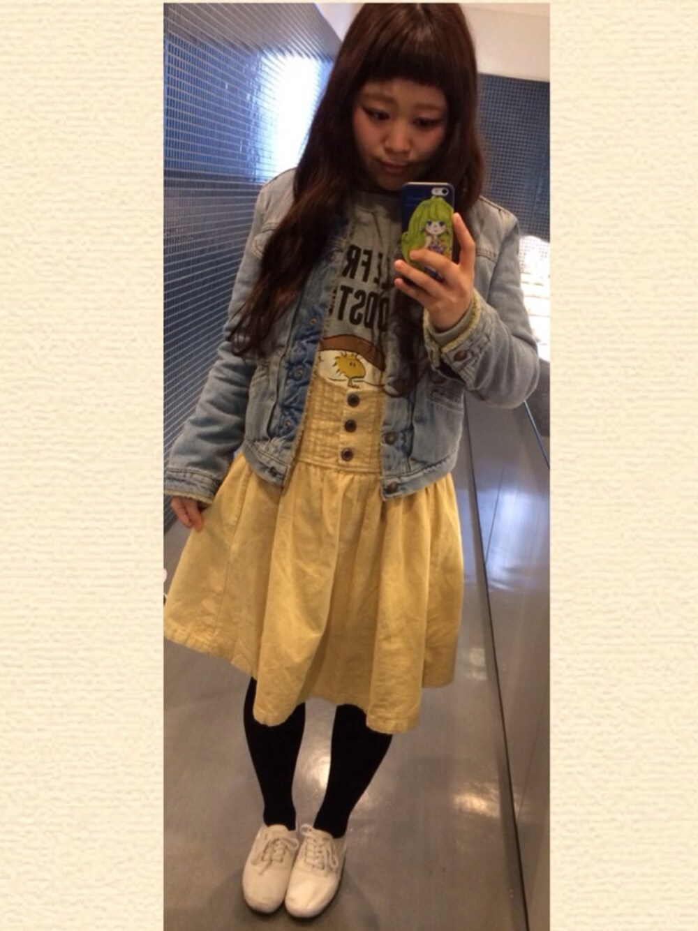 *デニムジャケット:Levi's *トレーナー:ユニクロ *ジャンスカ:レイカズン *リブ紺タイツ:Hanako *キャンバスシューズ:gu きょうは高円寺のdaidaiで購入したリーバイスの中ボアGジャンが主役です♪バックはハリスツイードのトートバッグ持ちました◎