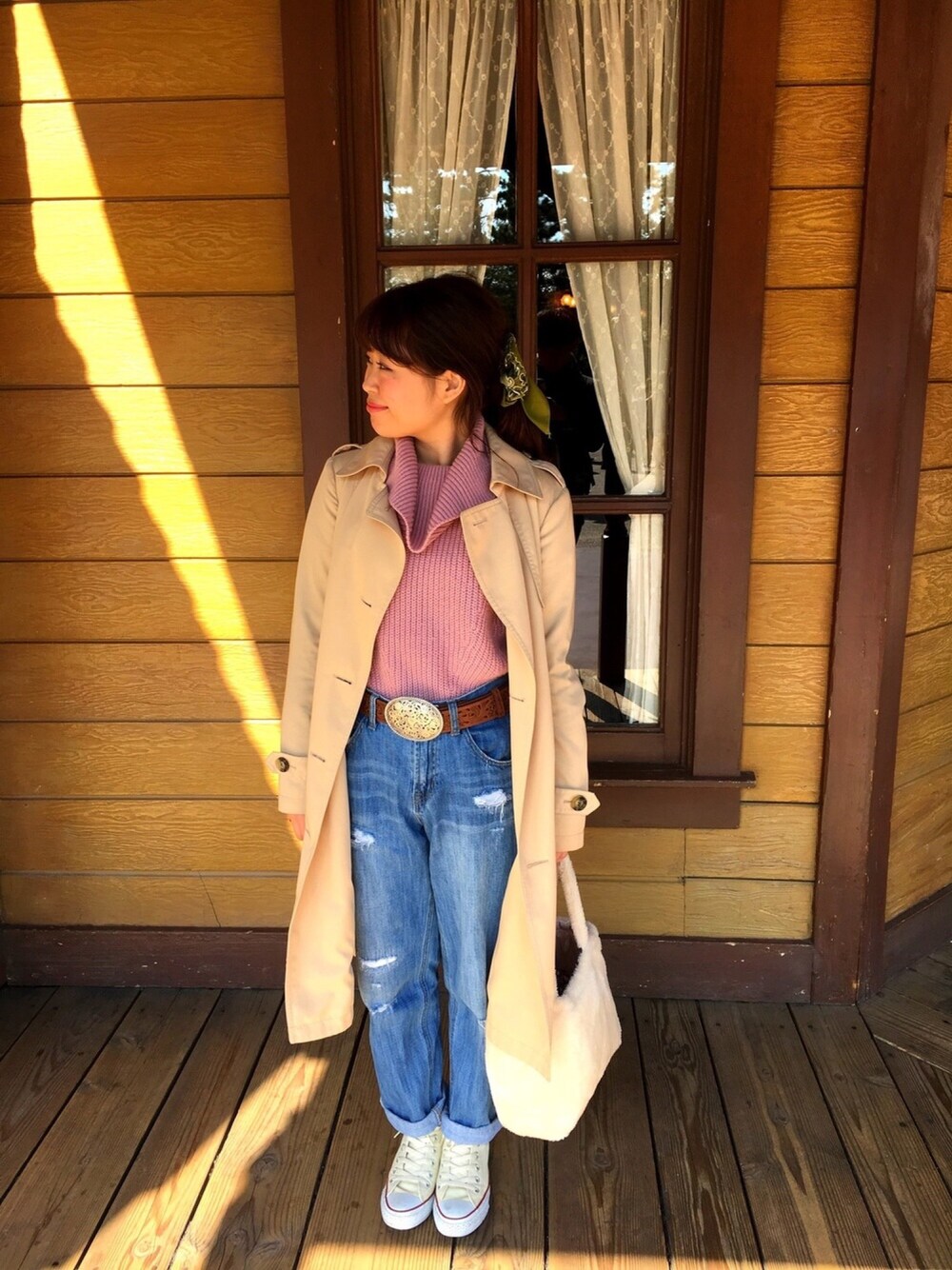 ポカポカ陽気ですね!かわいいピンクのセーターがすきです! ベルトと髪に巻いてるバンダナはディズニーランドで購入しました◎