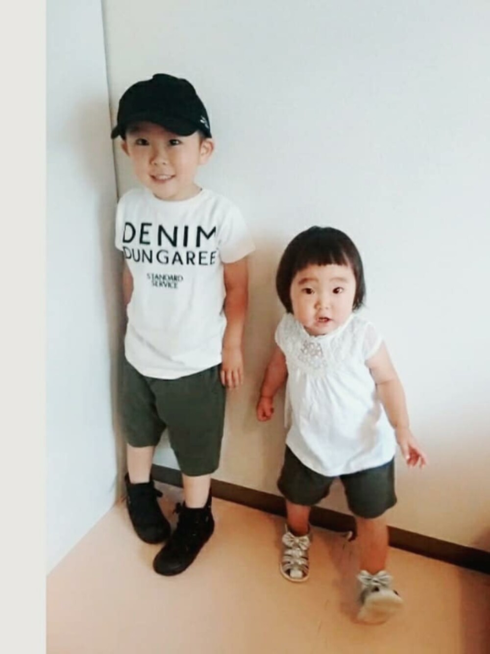 カーキパンツでリンクコーデ☺ quotiusefithのパンツでリンク😂 ハルカのパンツはアキラのお下がり👑 quotiのパンツは女の子も履けるから、これからお下がりたくさん履かせよう💓 ハルカのトップスはnexbaby🌸
