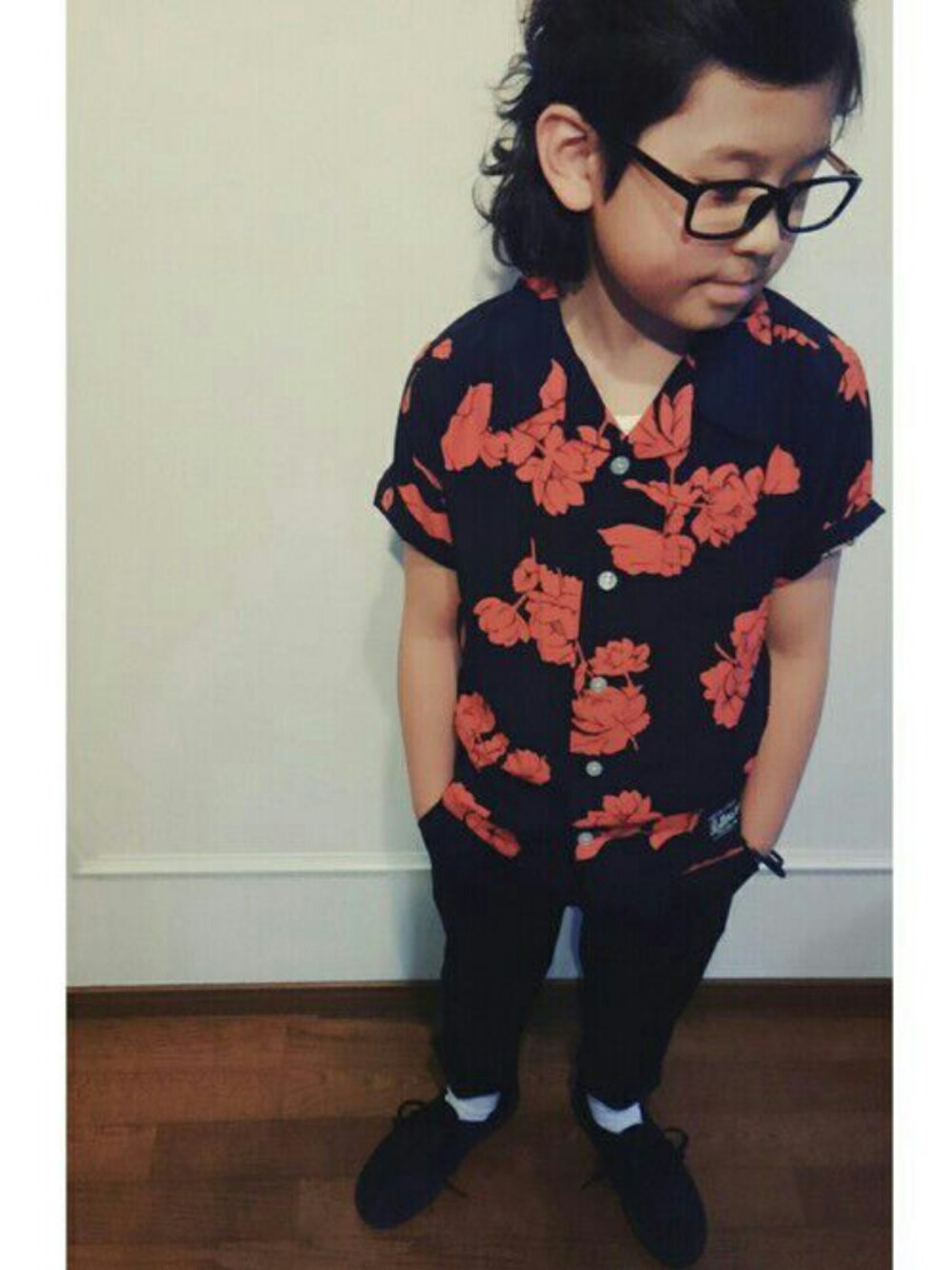 カタログを見て、本人が選んだシャツ☺ 親子でリリースを楽しみにしてました❤ スラックス➕白ソックスでチンピラ風味で。笑 実物は想像以上にめちゃめちゃカッコよくて、本人も相当お気に入り😍