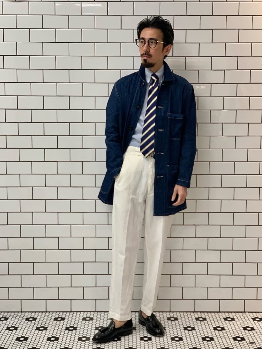 デニムカバーオールのタイドアップスタイルです。 ボトムスはホワイトで爽やかに、インはボタンダウンシャツとストライプタイとこってりアメリカンです。