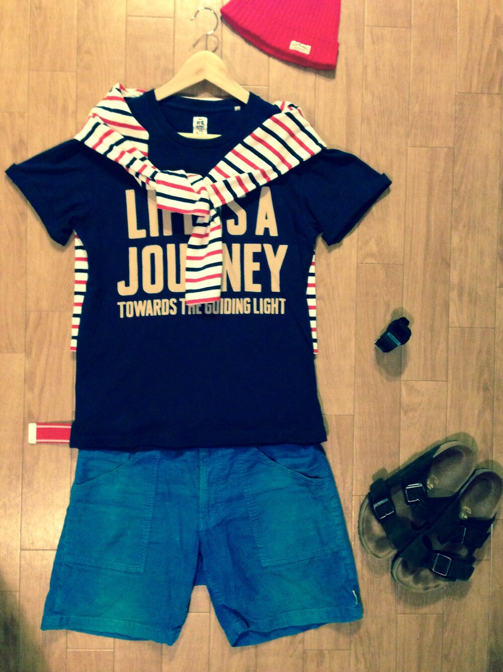 では、もうひとつのコーデです✳︎ 気持ち秋よりにしてみました✳︎肩掛けの赤白ボーダーのオーシバルは着てもよし、掛けてもよし、巻いてもよし✳︎ みなさんはどちらがお好きでしょーかー⁇