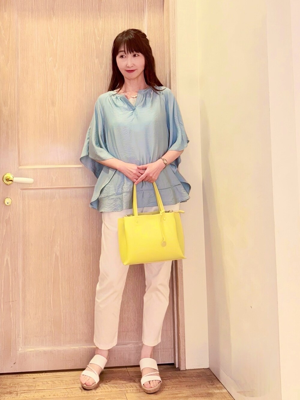 ブルーのゆるシルエットのお袖フレアドレープブラウスと、白の美脚見えイージーデニムとサンダルを合わせて夏らしく爽やかにꕤ*。゚ そしてレモン色の綺麗見え軽量バッグでキュートさをプラスしました🌼 ✤ꕤ サイズ感 ꕤ✤ 167cm/骨格ナチュラル どちらもMサイズ着用です ✤ꕤ 素材感・着心地 ꕤ✤ ブラウスは、触れるとひんやりする接触冷感機能付き。 落ち感があり動くと揺れる軽さ・しなやかさが特徴の素材を使用しています。 デニムイージーテーパードパンツは、美しいシルエットとリラクシーな着心地でとても動きやいです。 ✤ꕤ おすすめポイント ꕤ✤ ポンチョデザインのお袖が二の腕をさりげなく隠し、肘下はすっきり見え💕 裾のはしごレースがアクセントになっているのでインせず決まります❣️ ボリュームあるシルエットながらも、素材に落ち感があるのですっきり見え♪ スキニーパンツやテーパードパンツなど細身のパンツと合わせるとシルエットにメリハリがありバランスのいい着こなしに。 落ち感のある素材のワイドパンツと合わせればこなれたリラクシーなスタイルに。 着丈が長めのナロースカート合わせは大人上品なコーデに決まります。 💟ワールドオンラインストアにも投稿しております♪ 💟Instagramには➕日常も⭐︎ 是非見にきてくださいね🤗