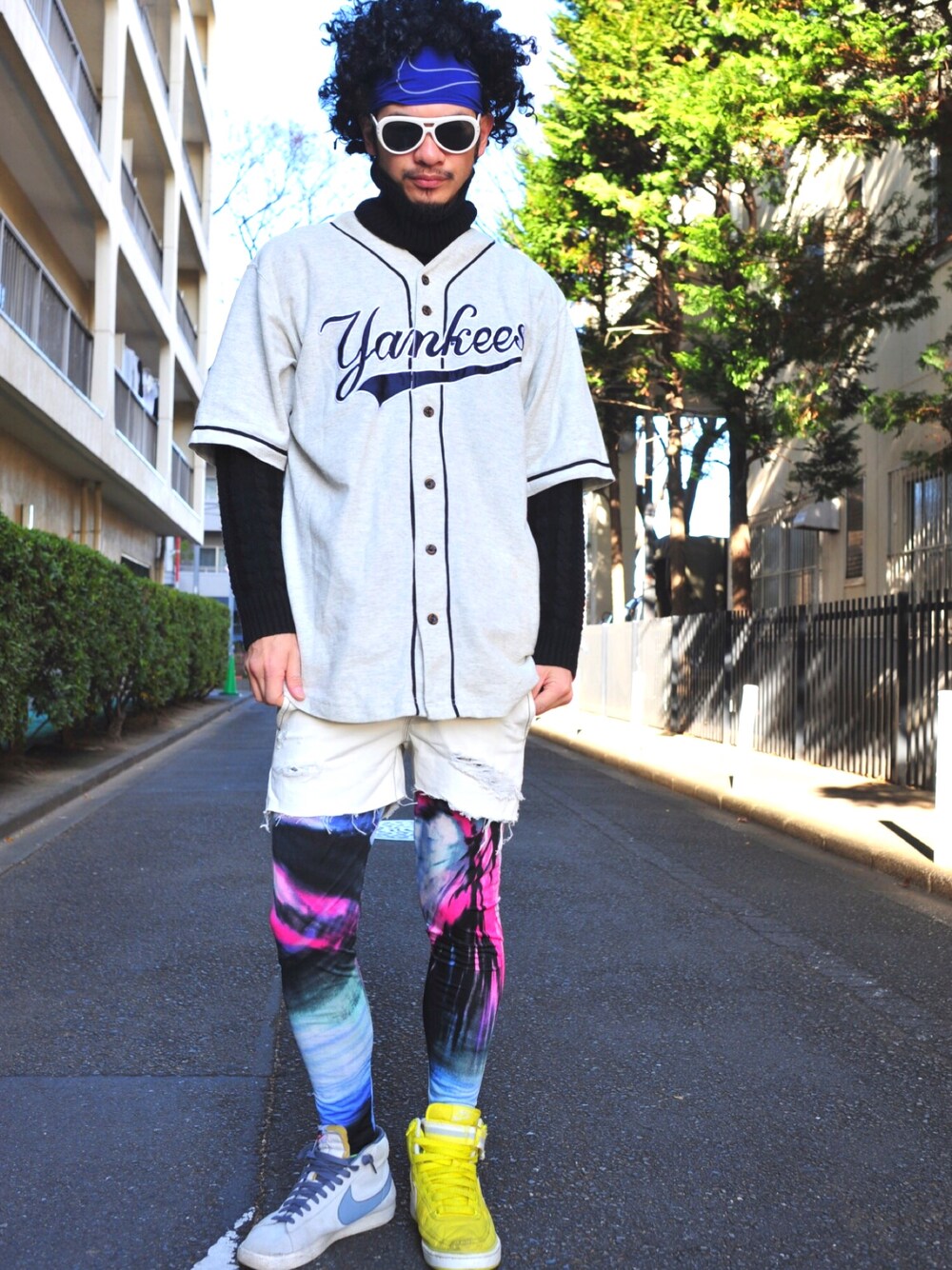 ブルー系のヘアバンドを着用したメンズの春コーディネートの1枚目の写真