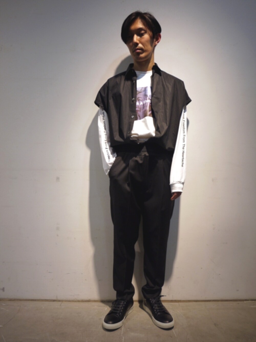本日は新しいレイヤードスタイルで合わせてみました! ロンTとビッグノースリーブシャツとのレイヤードが新鮮です! ストリートになりすぎない様にウールパンツをタックインしました!