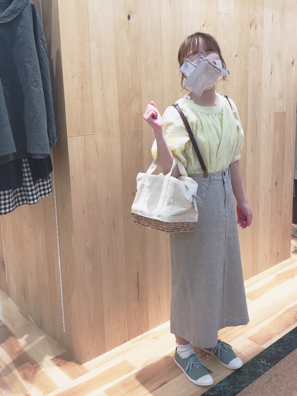 ナチュラルコーデです🙂 ブラウスのイエローとスニーカーのミントでとっても爽やかです☘️