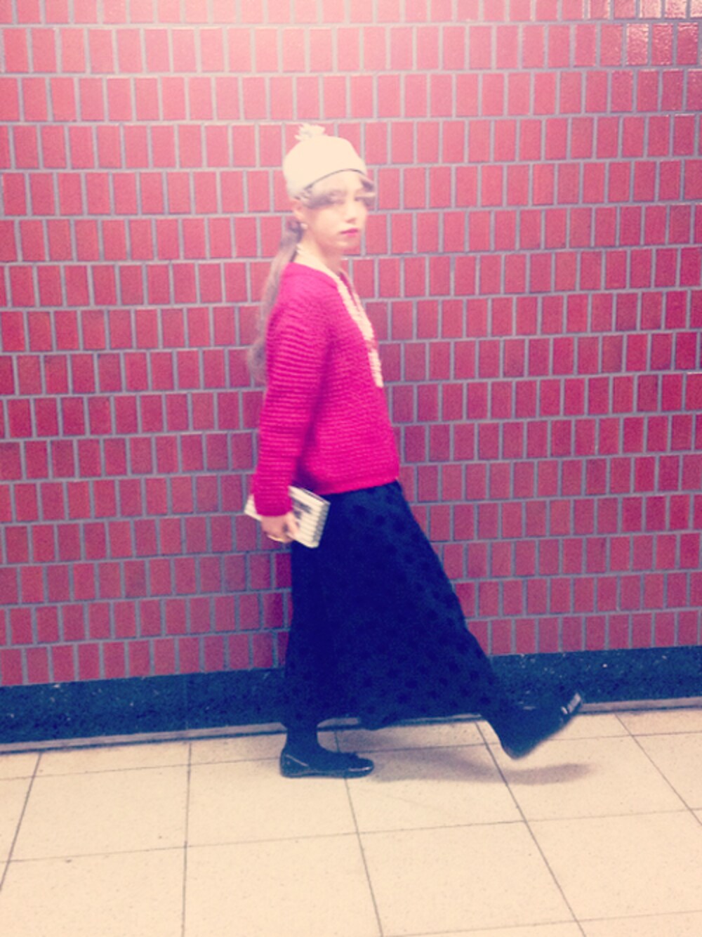 こんばんは。 お正月休みに、映画を見に行った時のコーデです。 映画を見てすぐに帰ろうと思っていたのでラフでした。 楽な格好が一番です。 発色のいいEbonyivoryのピンクのニットに、ドットのロングスカートを合わせました。 フロッキーでドットがぽこぽこしていて可愛いです、が、黒で光沢があるので可愛くなりすぎなくて良いです。 強いピンク×黒だとかっこ良いかんじになりますが、可愛らしい感じにしたかったので、Kvellの帽子のグレーとCHANELのパールネックレスとパールピアスで顔周りを明るくして、すこし強さを和らげました。 コートもnitcaのピンクのものでした。 冬は、ロングスカートを着ると靴もボリュームがあったり温かみのあるものだったりを選んでしまいがちなので、フラットシューズを合わせて軽さを出してみました。 映画見た後少しふらふらしていて、レンガの壁の駅があったのでとってみました。 なんか・・・・ホビットみたい・・・ ちなみに映画は見そびれていた「ABOUT TIME」を見てきました。 とてもとても良かったです。 春は赤いワンピース着て前髪眉上にしておでかけしたいなー。 きみに読む物語もそうですが、レイチェル・マクアダムスさんがとても可愛い。 弾けるような笑顔の女性にはかなわないなあと思いました。 ということで2015年はたくさん笑いのある年にしたいと思います。