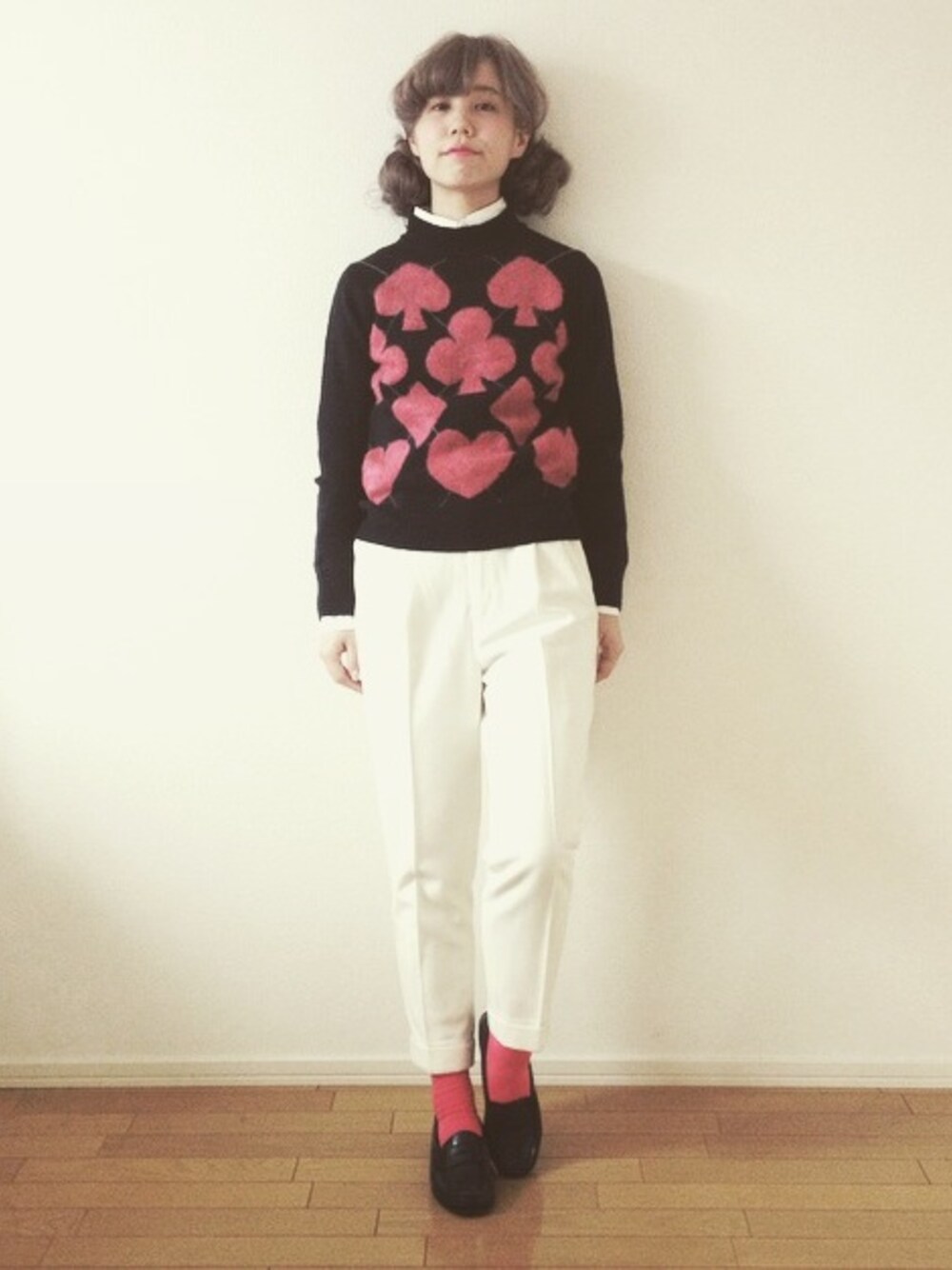 おはようございます。 ミドルネックからシャツチラ見せにはまっているので第三弾です。 トランプ柄の変わりアーガイルのCHILD WOMANのニット、色も可愛いです! いつもだったら、デニムかチェックのボトムとかあわせるのですが、白合わせても可愛いかなと思ったら合いました。パンツもCHILD WOMANです、ウールであたたかい! 靴下屋さんのピンクの靴下に、REGALのネイビーローファーを合わせました。 3色以内に絞るコーディネートって楽しいです。 服は割とまじめなアイテムたちなので、髪で遊びました。 大きいお団子耳のしたに2つつくりました。前髪はランダムに巻いて7:3くらいで分けて、幼くなりすぎないようにしました。 テーマ特にないのですが、やっぱりこういう王道っぽいコーディネートを、色で遊ぶのが好きだなぁと思いました。 あと本当に今年はピンクにはまってるなぁと思いました。 仕事してきます。 今週も一週間頑張りましょう!