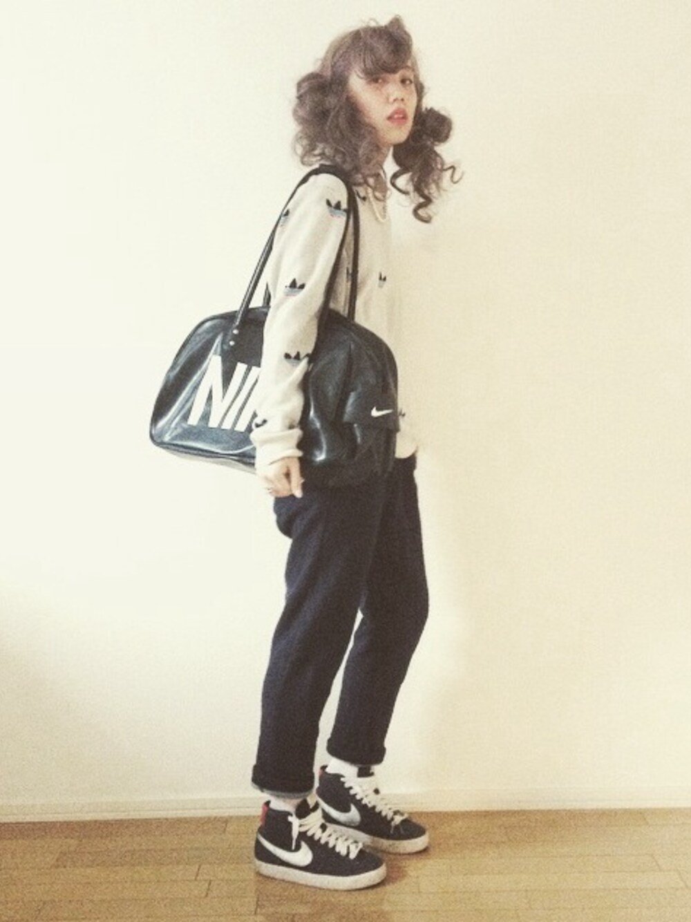 こんにちは。 よく晴れています。 晴れてるとお出かけしたい気持ちもつよいですが同時に日が当たる中で思いっきり昼寝するのもつよくなり葛藤します、、 とりあえず洗濯がはかどります。 最近ジムをさぼっているため自分への戒めとして、ジムにこれから行く人 のコーディネートにしました。 去年のBOYGALのパンツはゆるくてあたたかくて楽チンです。裾をおったときのシルエットが、ハイ〜ミドルカットの靴と相性がいいのでBLAZER合わせました。色の感じも可愛いです。 ネイビー可愛いなぁとおもったので、トップスは薄いグレーのadidas originalsのニット着ました。彼のなのでメンズですが、かたちがほどよくゆるくて 好きです。 少し外したかったのでcaphのパールつき付け襟つけました。ジムに行っても着替えやすいですね。 スポーツバックを持とうとおもって、リュック系かなと思いましたがすこしレトロなのも可愛いかなと思って肩掛けタイプにしました。 NIKE!!て感じが気に入ってます、、 ポイントになりますね。 アディダスのマークとナイキのマークが沢山あってどっち派なの?て感じが面白いかなとおもって少しふざけてみました。 わたしはNIKE派です、多分。 ふざけたといえば髪もちょっとふざけてみました、 まとまってるのかまとまってないのかよくわからない髪型です。 服が男の子っぽかったので、可愛らしさも少し出したかった結果こうなりました。 昼寝ちょっとしちゃおうかなぁ。