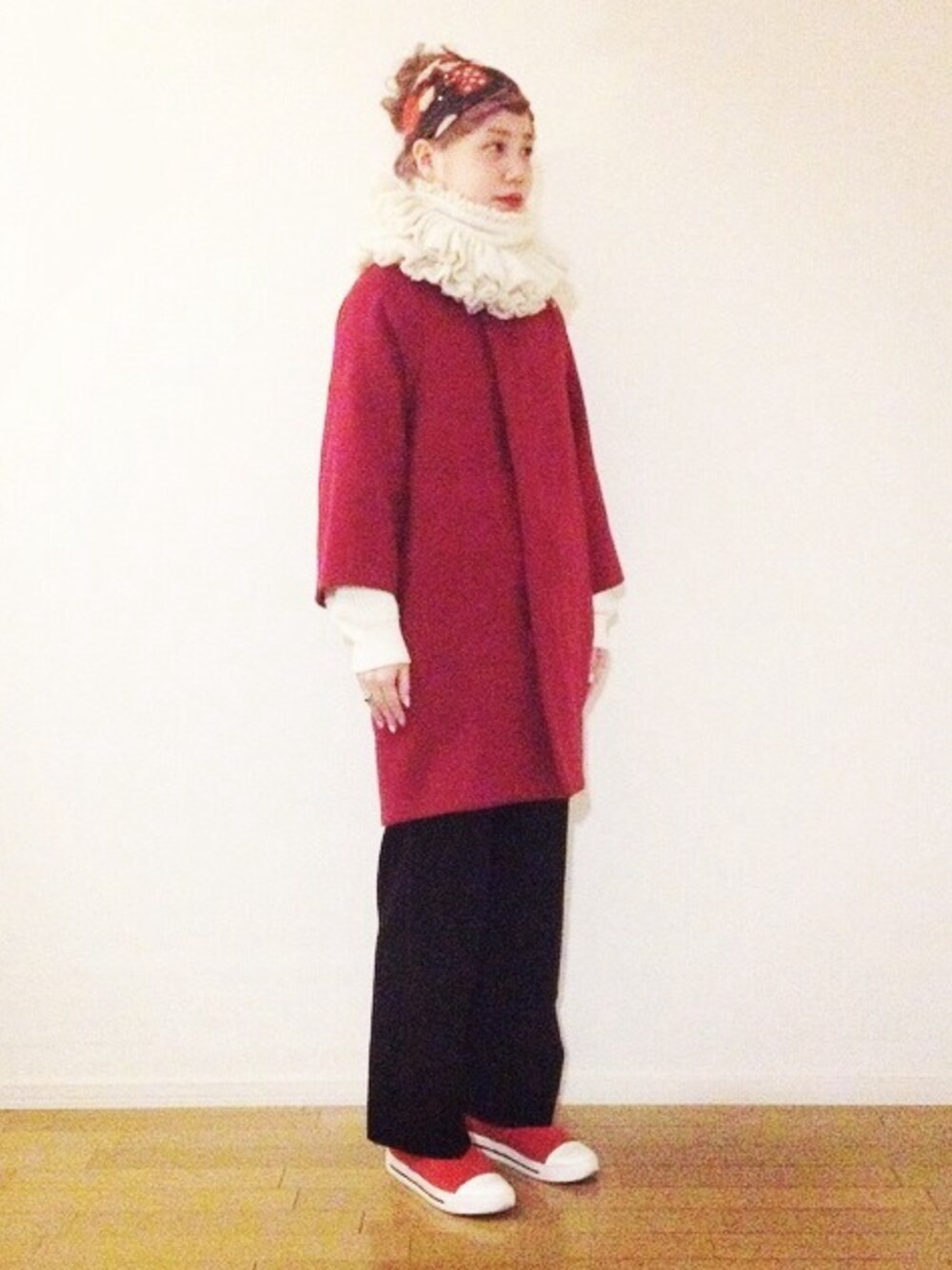 こんばんは。 お腹いっぱいです。 いちご大福が1番多そうだったので、いちご大福みたいな人の服まず載せてみます。 一昨年くらいに購入したニトカの赤コート、やはりこのかたち大好きです。 これくらいの丈のコートに、ワイドパンツを合わせるのが、パジャマの上にコート着てちょっとそこまで感が出て好きです。 スリッポンだと更にでますね、ちょっとそこまで感。 motherのむかーしのフリフリのストール?マフラー?をぐるぐる巻いてエリマキトカゲにしました。つけ襟みたいでかわいいです。 長くてボリュームがあるので、巻かないで首に垂らすだけでも可愛いのでまた載せます。 ぐるんぐるんだからちょうあったかいです、、 首にボリュームがあるので、髪はまとめたいたいなと思ったので巻いたのをお団子にして、前髪も短くしてすっきりさせました。 3年?くらい前のプープレのあめちゃん柄ヘアバンドが色もピッタリでした。 いちご大福がテーマですが、肩から上はいちごのショートケーキみたいでもあるような気がします、、 あ、パンツの黒は一応あんこのつもりです、、 録画していた先週の水曜日のダウンタウンを見終わったので、今からゴッドタンとざっくりハイタッチ見ます。でもちょっと眠いです、、、 次は頭にスカーフ巻いてる人を更新します。 明日は仕事で海沿いに行くのですが寒そうで今から怯えています。何を着ようかなぁ。 ホッカイロたくさん貼らなきゃ。 やっぱり修造さんが日本にいないから寒いんですかねぇ。