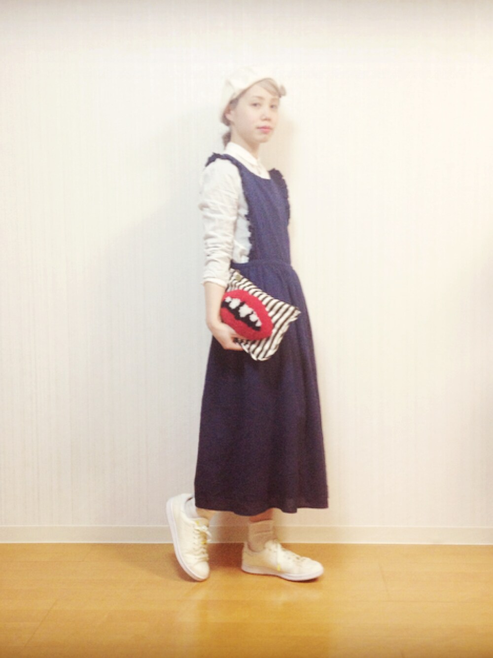 こんにちは。 今日はお休みです。家事をばーっと終わらせ、お昼寝タイムに入ろうとしています。 今日はちょっとナチュラル系のコーデです。 今年購入したPAR ICIのエプロンワンピ、小さなフリフリが可愛いです。 白と迷ってネイビーにしたのですが、白も買えばよかった、、、 合わせやすいですし、フリルが控えめだからか意外と上半身ストンとしたシルエットできれいです。幼くならないというか、、。 noteの何年か前に購入した白シャツを中に着ましたが、衿のないロンTとかボーダーでも可愛いです。 コットンの白ベレー帽に、白のスタンスミスあわせました。 ロング丈のワンピに白ソックスとローカットのスニーカー合わせると安心感がすごいです。 ちょっとトリコロールにしたいなと思ったので今年購入したKARINEの唇クラッチ合わせました。 唇が超立体的でモフモフしててもうなんか一目惚れでした、、、 たっぷり入るので重宝しています。 やっぱり唇モチーフに目がないです、、。 髪は後ろは三つ編みしてさいごにお団子にしてまとめて、前髪は多めにとってはねさせました。 ベレーかぶると前髪はねさせたくなる病にかかってるみたいです。 テーマはよくわからないのですが パン屋さんかなぁ、私がパン屋さんならこういう制服にしたいです。 クラッチバッグくらい大きな口だったらパン何個でも食べれそうですね。 今朝はパン食べました、デニッシュトーストにクリームチーズとイチゴジャム、ジャムは色々買ってみますがアオハタがいちばん好きだったりします、、、 ここまで書いて寝落ちし、さっきまで出かけていました。 お酒を飲みました! 今からブログを書きますー!