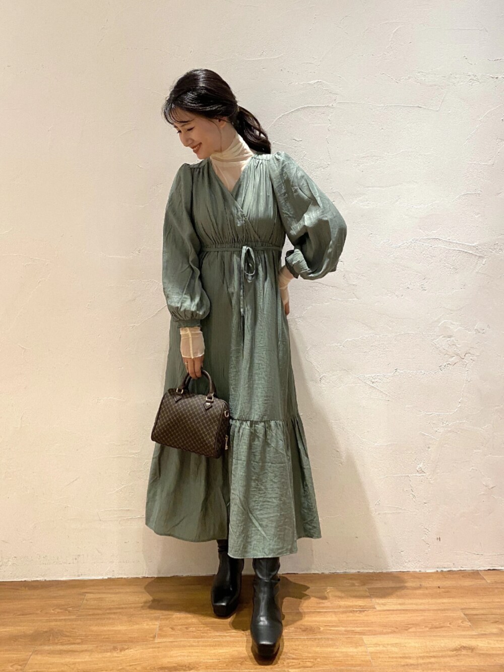 女性らしいカシュクールのワンピース💚 インナー次第で冬まで使えます!