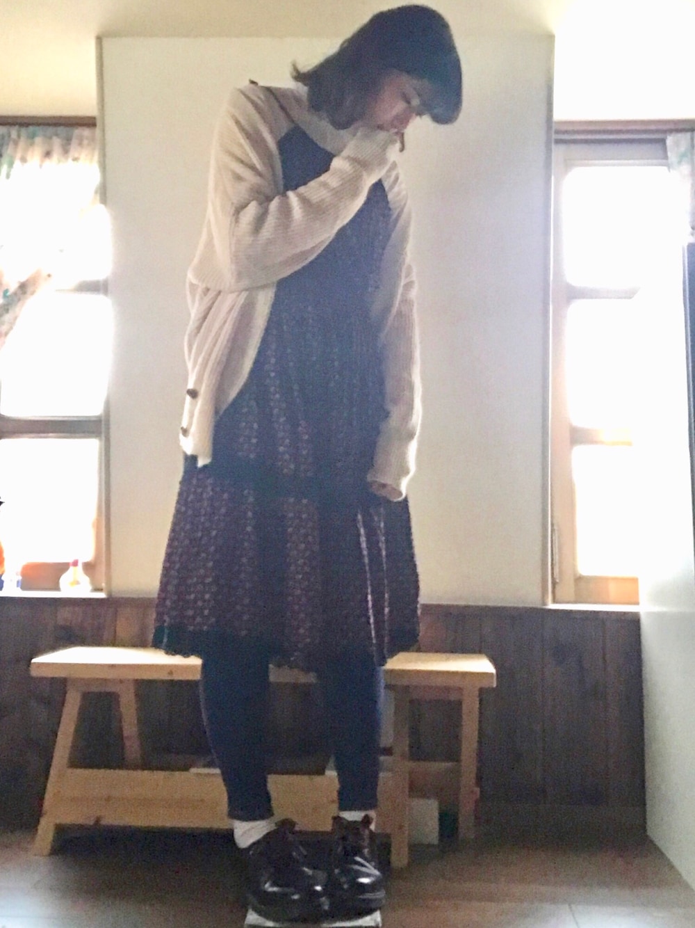 写真がみにくくなっちゃいましたが… 古着屋で買った花柄のワンピースにデニムとマーチンを合わせました! 寒いのでカーディガンも