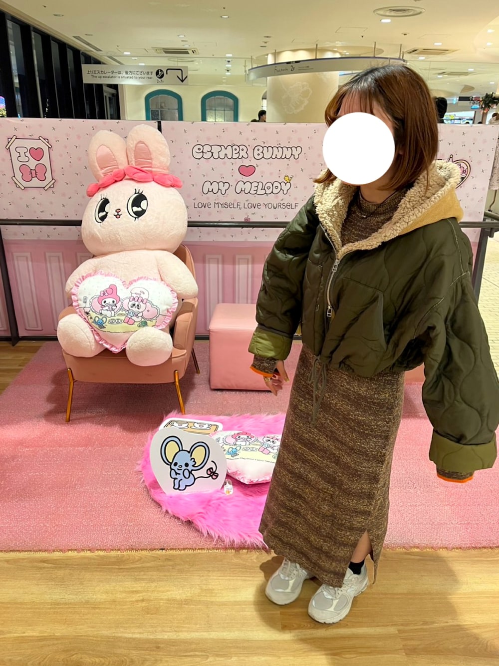 ソラマチで開催されてるエスターバニーのポップアップに行ってきた😄 カジュアルに着たかったので、お気に入りのキルティングジャケットにふわふわベスト中に着てみたら可愛かった☁️ ソラマチはクリスマス感じたな〜🎅🎄