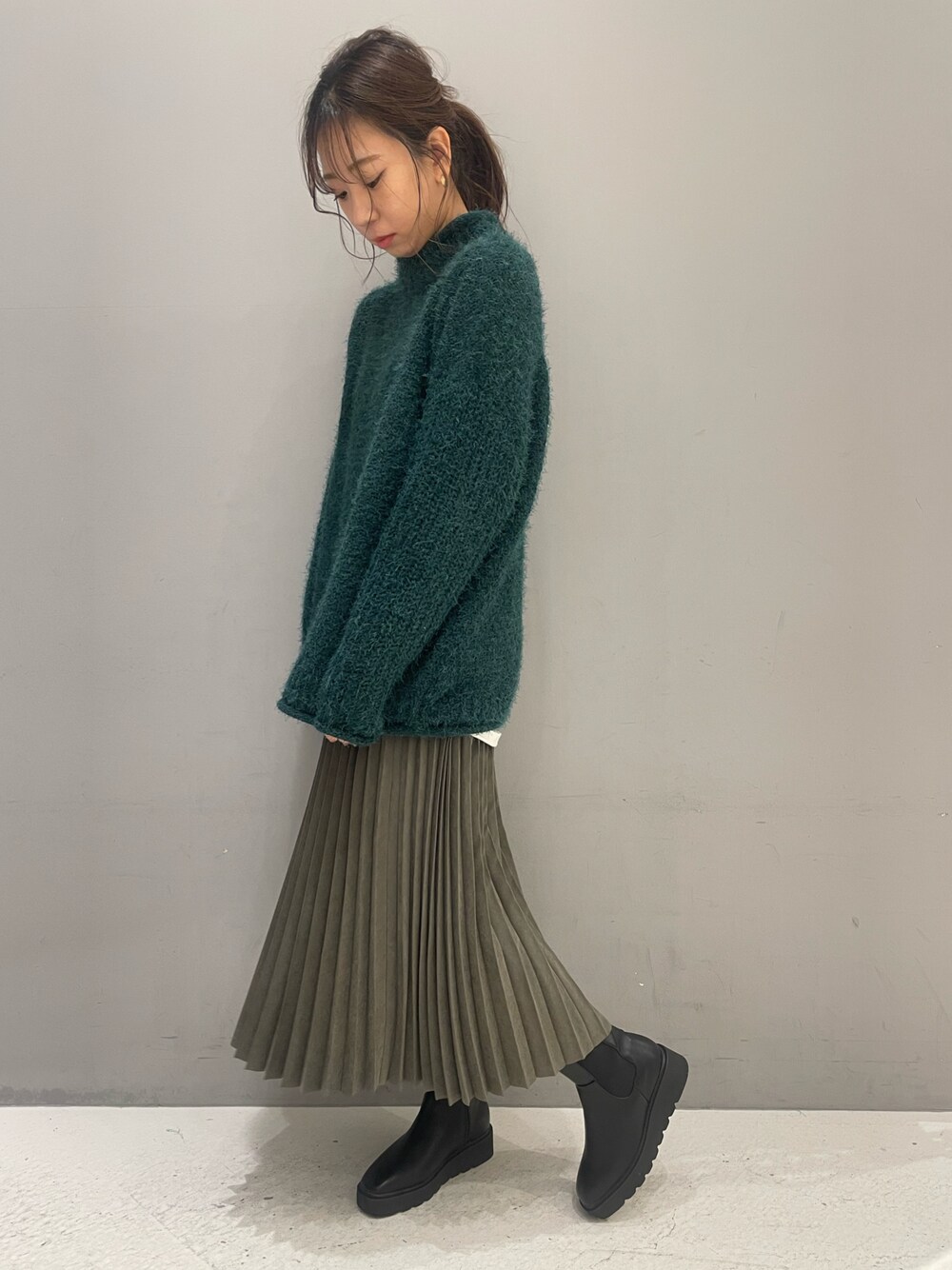 ◆トップス:Fサイズ ふやふわとしたシャギー素材が可愛いニット 。 落ち着いたお色味なので可愛くなりすぎず大人っぽい雰囲気になります。 スタンドネックなので首周りもあったかです◎ ドロップショルダーと丸みのあるシルエットが華奢見えさせてくれます。 ご自宅で洗えるのも嬉しいポイント! ◆ボトムス:Fサイズ ピーチ起毛素材で冬仕様のプリーツスカートです。 プリーツスカートはカジュアルにも綺麗めにも使えるので1枚あるとコーディネートの幅が広がりますよ〜 167cmだとふくらはぎ下くらいの長さなので、ショートブーツで合わせるのがオススメ◎