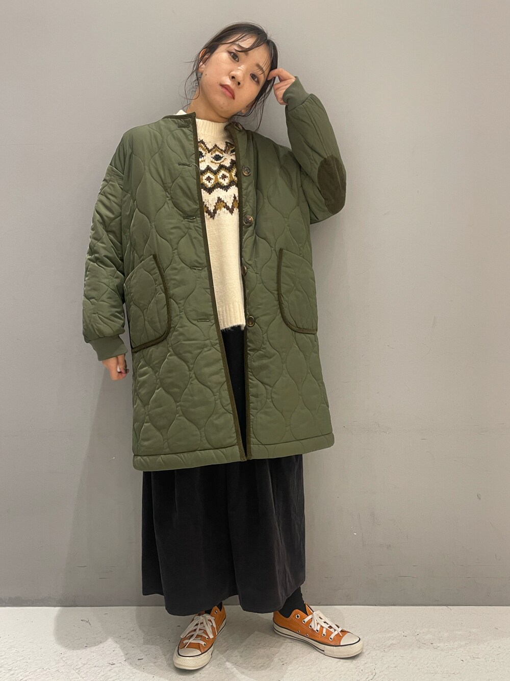 ◆アウター:Fサイズ 人気のキルティングコート! お尻がすっぽり隠れるくらいの使いやすい長さがお気に入りポイント◎ ポケットやフロント部分はコーデュロイの配色になっています。 ノーカラータイプなのでマフラーやタートルニットなど首元のおしゃれも楽しめます! Iラインのシルエットなのですっきりとした印象でお召し頂けます。 ◆トップス(ニット ):Fサイズ 求心柄が目を惹くニット 。 落ち着いた配色なのでコーディネートに取り入れやすいです。 ふわふわした肉厚な生地で暖かくお召し頂けます。 袖はワイドスリーブでこなれ感が出せます! ◆ボトムス:Lサイズ コーデュロイ素材で冬コーデには欠かせないアイテム! タックが入っているので程よいフレアシルエットで立体感がでます。 Lサイズ着用していますが、Mサイズだと3cm程丈が短めになります。 ポケット付きです!