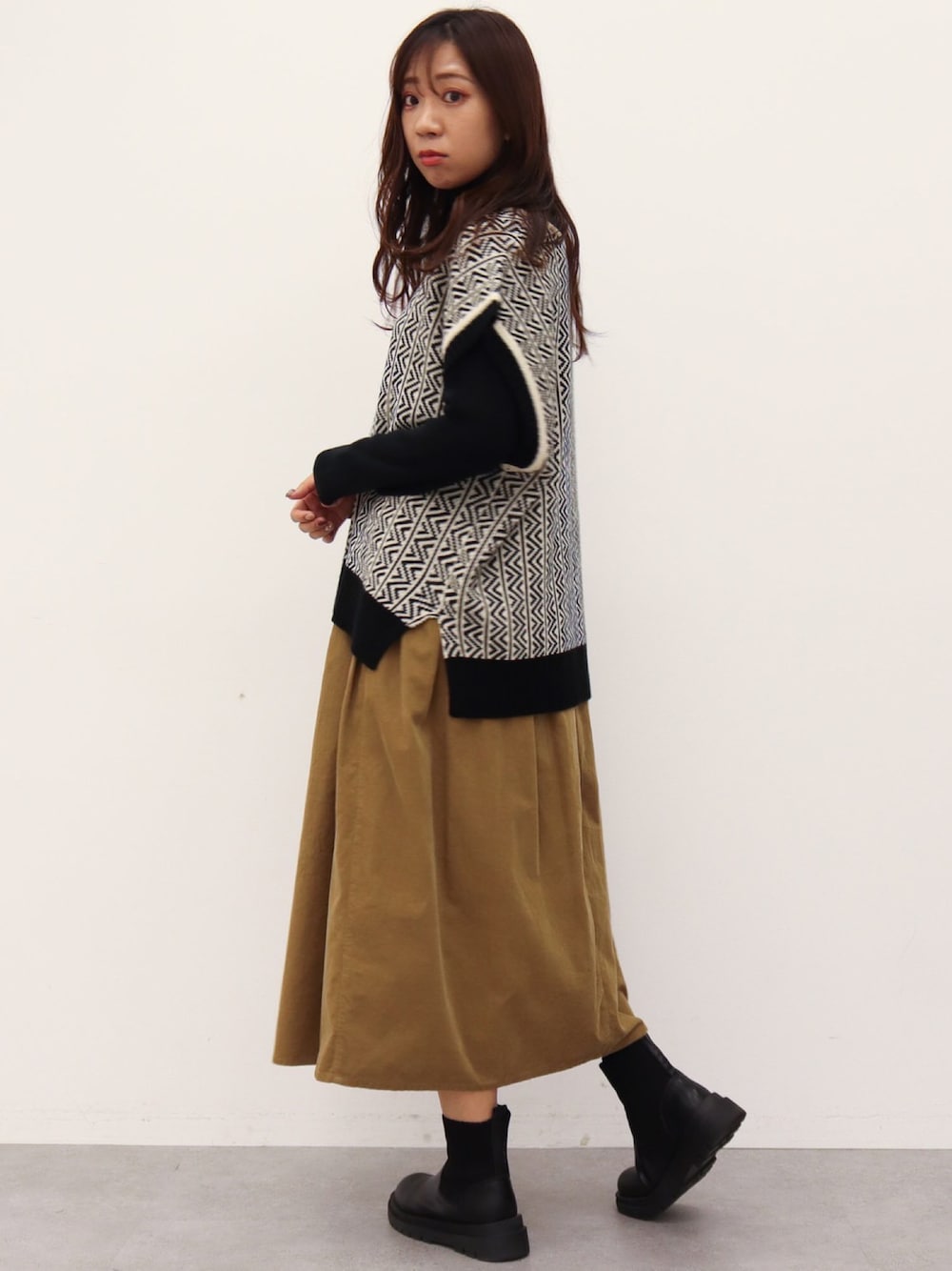 ◆トップス:Fサイズ ケーブルニットとシャツのドッキングデザイン。 1枚で重ね着風コーデが完成します! 裾のシャツ部分はアウトスタイルでもインスタイルでも決まるので、合わせるボトムスやその日の気分で違った着方ができます◎ ◆ボトムス:Mサイズ コーデュロイ素材で冬コーデには欠かせないアイテム! タックが入っているので程よいフレアシルエットで立体感がでます。 Mサイズ着用していますが、Lサイズだと+3cm程丈が長めになります。 ポケット付きです!