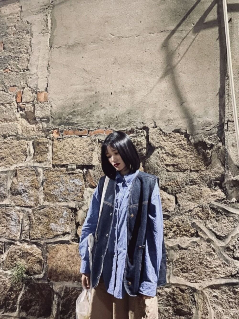 🧸ootd丨日系古着风 # 蓝格纹古着衬衫+复古牛仔马甲 # 卡其色工装裙 # Have A Nice Day 帆布包