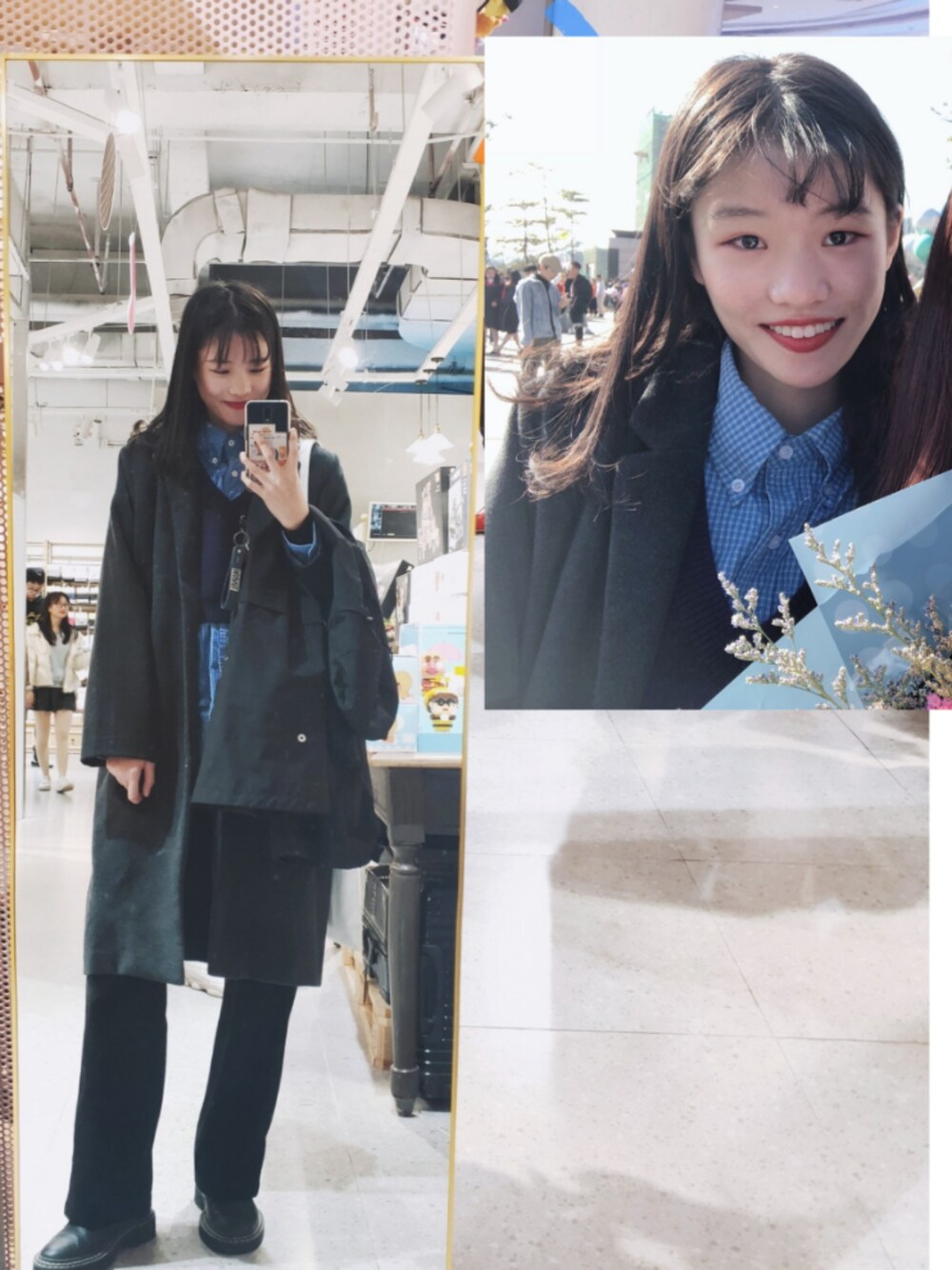 🧸ootd丨中性学院风 # 蓝格纹古着衬衫+葡萄紫针织马甲 # 灰黑色西装长大衣 # 黑色西装裤 # 黑色荔枝纹马丁靴 配上小卷毛💫是中性学院大姐没错💨