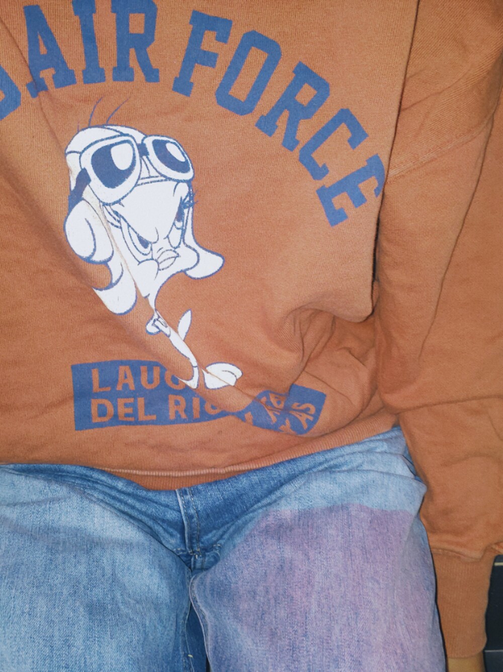 🧸ootd丨古着风!! # 暗橘色鸭鸭卫衣 # 复古染色拼接牛仔裤 # 黑色荔枝纹马丁靴 没拍全身图太可惜了😢自己巨喜欢这身。 一整身都是偏暗的色调,然后各自有小亮点哈哈哈,比如卫衣上的鸭鸭、裤子的红色染色。 而且卫衣上的一点复古蓝和裤子颜色是同色系呼应的! 然后再穿一双马丁,也可以对应黑色中发哈哈哈哈 一定要找机会拍个全身📜