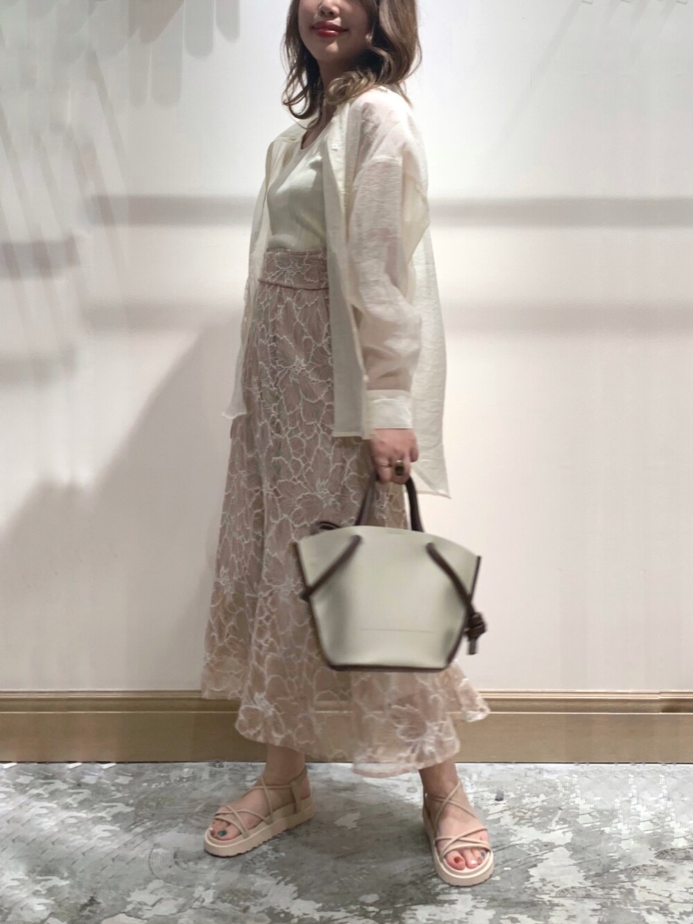 【トップス】 着用カラー:アイボリー 着用サイズ:フリー -------------------- 透け感:あり (裏地:なし) 伸縮性:なし 生地の厚さ:薄め ------------------- サイズ感:ややゆったり 素材感: 透け感のあるシアー素材 着た感想: 腰周りをカバー出来る絶妙な丈感です。 長すぎないのでインスタイルにも使えます。 シアーなので夏場に羽織で使うのもおすすめ。 【スカート】 着用カラー:オレンジ 着用サイズ:フリー -------------------- 透け感:なし (裏地:あり) 伸縮性:なし 生地の厚さ:やや薄め ------------------- サイズ感:ややゆっり 素材感: さらっとしていて夏も使える 着た感想: ウエストがゴムなので楽に履けます。 タイトでは無いので腰まわりが気になる方も安心して履けるゆとりがあります。 164cmで長いまま履いて足首見えるくらいです。 1回折ると6.5cm程丈が上がるので小柄な方にもおすすめです。 【サンダル】 着用カラー:アイボリー 着用サイズ:Lサイズ ------------------- サイズ感: 普段24cmから24.5cmでLサイズがぴったりでした。コンバースのような幅の狭いスニーカーだと25cmを履いている足のサイズです。 甲が高めなのですがLサイズを楽に履けています。