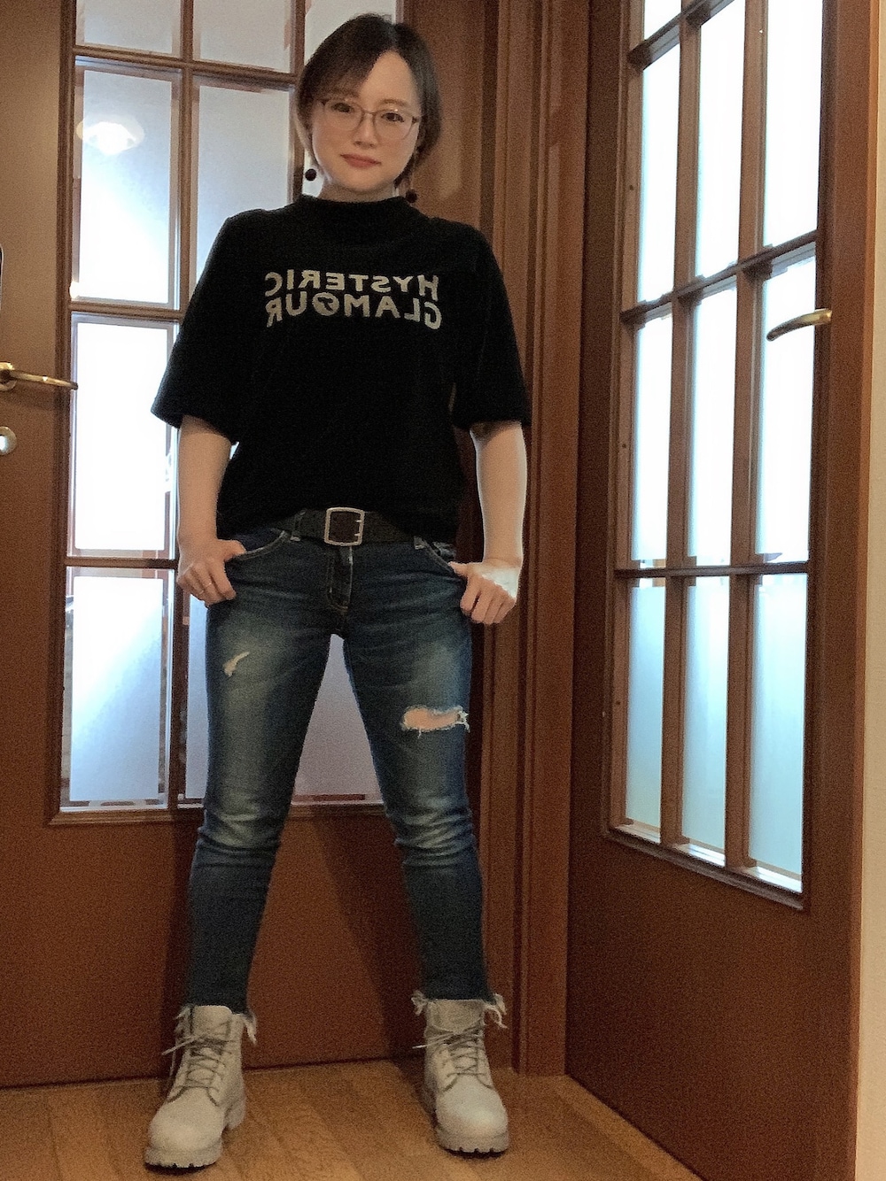 ヒステリックグラマーのベロアの半袖に、ダメージスキニージーンズを合わせました。半袖ベロアは、今の季節にちょうどよいです。Timberlandは、グレーのスウェード素材です。