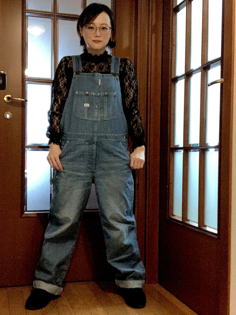 Leeのオーバーオールに以前WEGOで購入したレーストップスを合わせました。このトップスは、そこまで肌が透けないので、いやらしさがなく着やすいです。