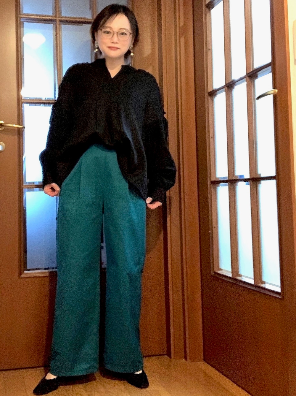 グリーンとブラックのツートーンコーデ。足元はスウェード素材のミュール。ピアスはグリーンアイのゼブラピアスにしました。