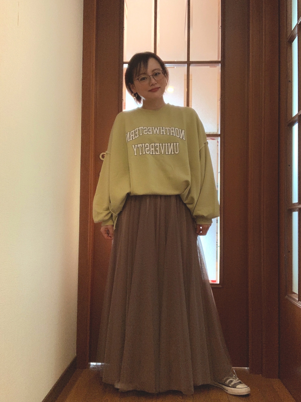 モスグリーンのスウェット。袖がぽわんとしてて、裾がゴム仕様ではなくストンとしているところもお気に入りです。チュールスカートはガーリーになりがちですが、このトップスに合わせると 、カジュアルな感じになりました。