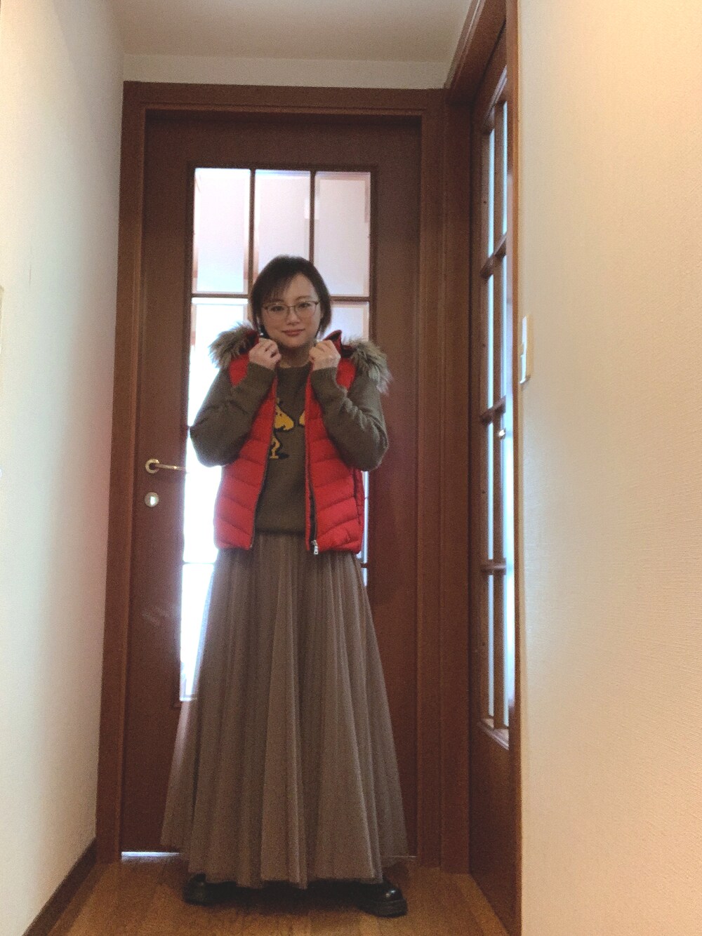 ウッドストック柄のカーキ色ニット。ウッドストックのガールフレンド?の頭についてる赤のリボンが可愛くて気に入っています。