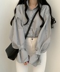 メンズライクコーデ。袖がフレアのシャツと、首元にベロアリボンをネクタイ風につけて、少しガーリーに。