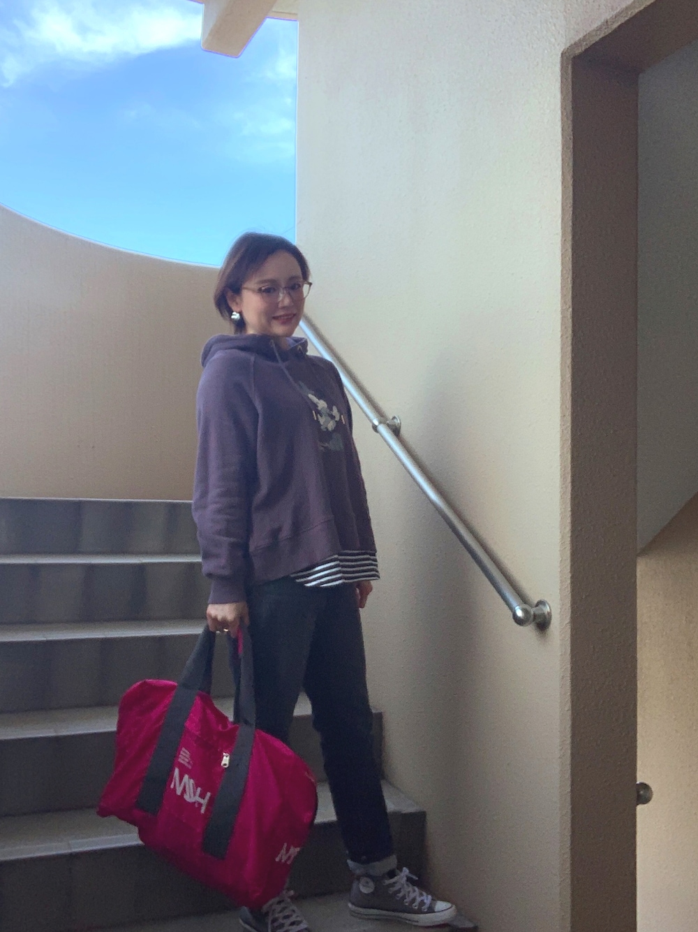 買い出し𝐃𝐚𝐲のモノトーンコーデ。グレーなミニーマウスが可愛いスウェット。古着で500円でした。グレーの持ち手のピンクボストンは、軽いし収納力抜群です。