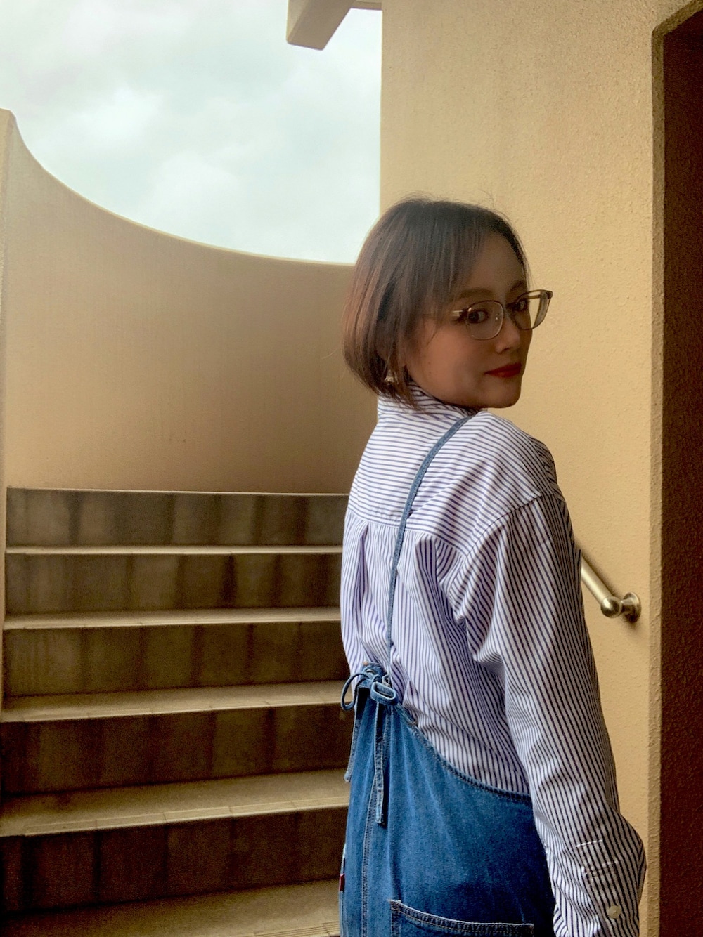 デニムサロペット×ストライプシャツ。このサロペは、フロントのジッパーとバックデザインがよい感じです。