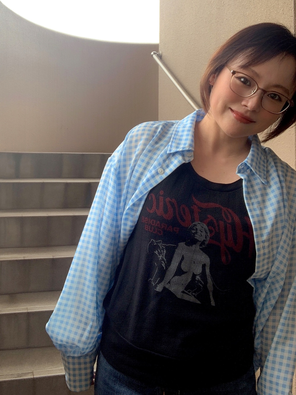 着回しコーデ。 シアーシャツを、ボレロ風に着たいなと思って。シャツのフロント部分の裾を背中側で結んでみました。(なので、後ろは長いままです。) 雨予報なので、ズボンの裾汚れそうで、ついついの厚底シューズ。