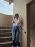 シンプル&リラックスデニムコーデ。 背が低いけど、サスペンダーのおかげで、なんとかなりました。 スニーカー履いてて見えないのですが。最近おきにいりの「エビフライわんわん」(正式名不明…)のソックス履いてます꒰ᐡɞ̴̶̷ ·̫ ɞ̴̶̷ᐡ꒱ ウエストのベルトをギュッと締めても、かなりのゆったりサイズ。これなら冬ニットをinしても着られるそうだなー(´˘`*)