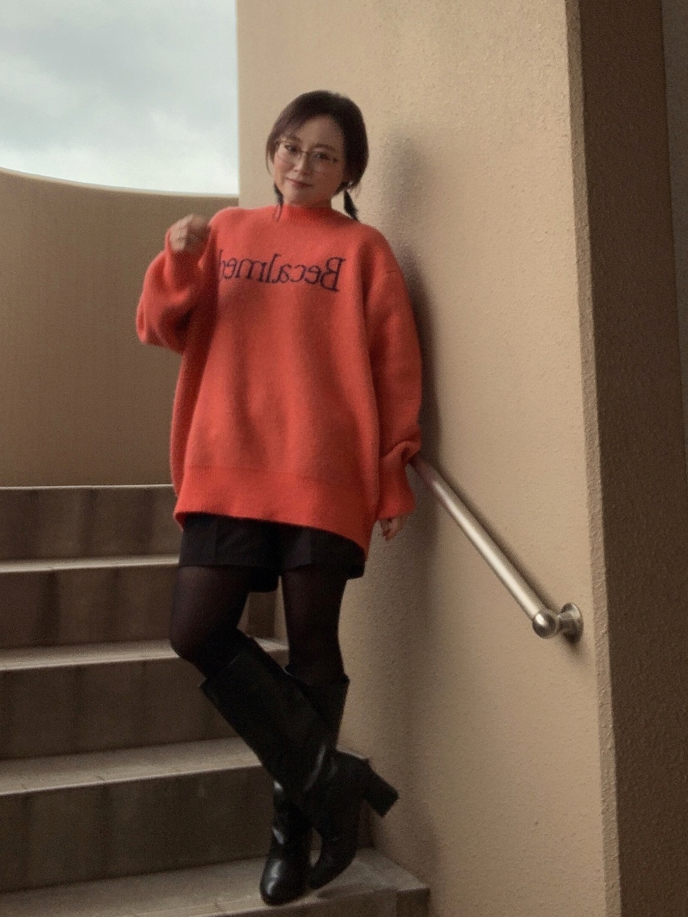 久々のショート丈ボトムス×ロングブーツ 「このニットに、ショート丈ボトムスをコーデしたいな」と。 ひそかに思ってたので、 思い切ってやってみました。 今日はXmas Eve🎄ですね。 主人は仕事でしたが(基本日曜は仕事)、 主人の仕事後、一緒にケーキを取りに行く予定にしてて。 (毎年、デパートでケーキを予約します。 そのデパートで積立してるから、それを使って🎂買いたいからです🤣) 毎年、メインはチキン🍗だけど、 「今年はステーキがいい」とのリクエスト なので、 ケーキ受取りついでに、お肉も買うことに。 夕方から出かけられるように、 朝早くから、掃除を済ませ、 Xmasのごはんの支度をせっせと…💦 「ん⁉️」 なぜ私がわざわざ行くか… 主人に頼めばよいのでは? と、普通なります。 もちろんケーキ受取りだけなら、 頼んでました。 だけど、今回はお肉も買います🥩 主人に任せたら、とんでもない値段の お肉を買いかねないのです(꒪⌓꒪) Xmasだし、そこそこいいお肉買うにしても、 限度ありますもんねー(主婦は、こうなる𐤔𐤔) そんなこんなで、バタバタ身支度して… 気づいたらもう日が暮れかけてて。 なので、写真(1枚目&2枚目)が、 フィルタなしの、リアルセピア色なっとります𐤔𐤔 (ケーキを受取りに私が行き、その間、主人がお肉やさんに行ってたのですが…。5分経たぬうちに主人のところに行けたものの…すでに主人が購入してて🥩…(꒪⌓꒪) お店の人から「ご贈答用ですか?」と聞かれたそうです…。値段を聞き、久々に膝がガクガクなりました(꒪⌓꒪)…ちなみに、お肉は主人が買ってくれました。) みなさん、よいXmasを✨️ (なんとか投稿&みなさんのとこにお邪魔できて、よかったです💦)
