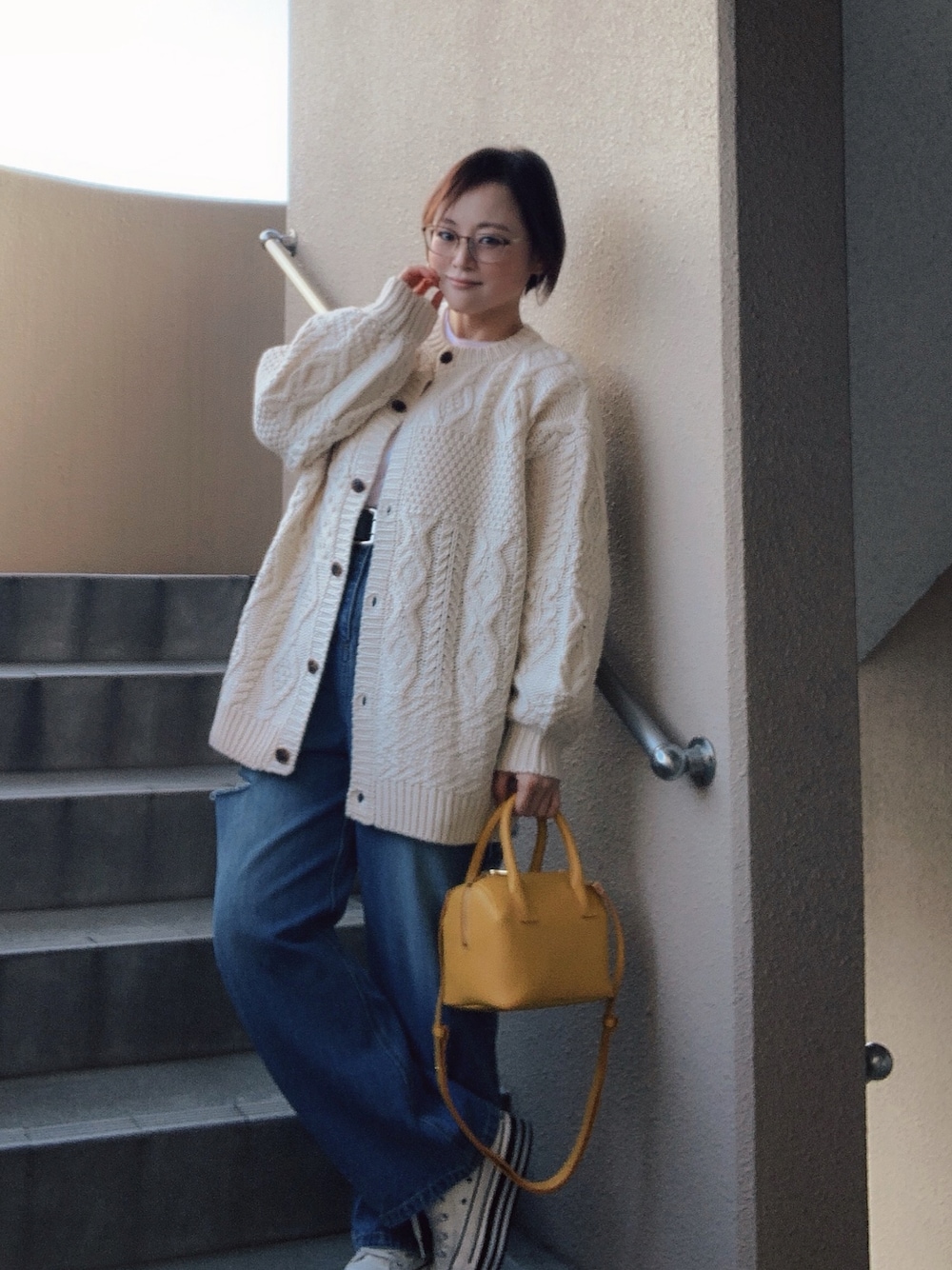 シンプルコーデ×ちょこんと💛 「そういえば、私、ニットのカーデ持ってないわ」と。 大好きなungridで、色んな編み目のニットカーデをGET 長めの着丈で、ウッド風なボタンもかわいい🥰 ボタン全閉じもよきだし。 ボタンの方を後ろ側にしても。シンプルニットな感じでよきよき✨️ パープル💜ch!iiiショルダーバッグを買った時に、実は気になってたch!iiiのミニボストン。 「そんな、たくさん👜買われませんよ( ・᷅-・᷄ ) 我慢がまん‼️」と。 言い聞かせたはずが。 買っちゃった🤣 「イエロー💛バッグ持ってないし❗️小さく見えて長財布も入っちゃうし‼️そだそだ、買って正解だ‼️」と 自己暗示にかけてます𐤔𐤔𐤔𐤔