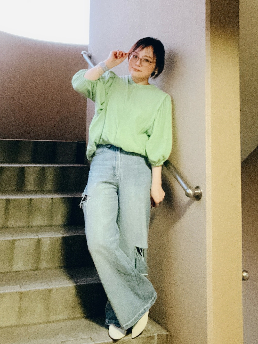 グリーン×ライトブルー 夕暮れ時に📷したからか、 ほややーんとした写り そして、いつもながらの風にあおられ、 前髪もほややーん𐤔𐤔 2枚目📷は、ポラロイド風とかいう加工があったので、選んでみました。 足元とピアスはホワイト バングルはシルバーに ブラウスは前後2way 今日はボタンのある方(とゆっても、隠しボタンみたいなデザインなので、1番上のボタンしか目視できない𐤔𐤔)を前にして着ました。 この日はすごく暑かったので、このくらいの袖&素材がちょうどよきでした(´˘`*)