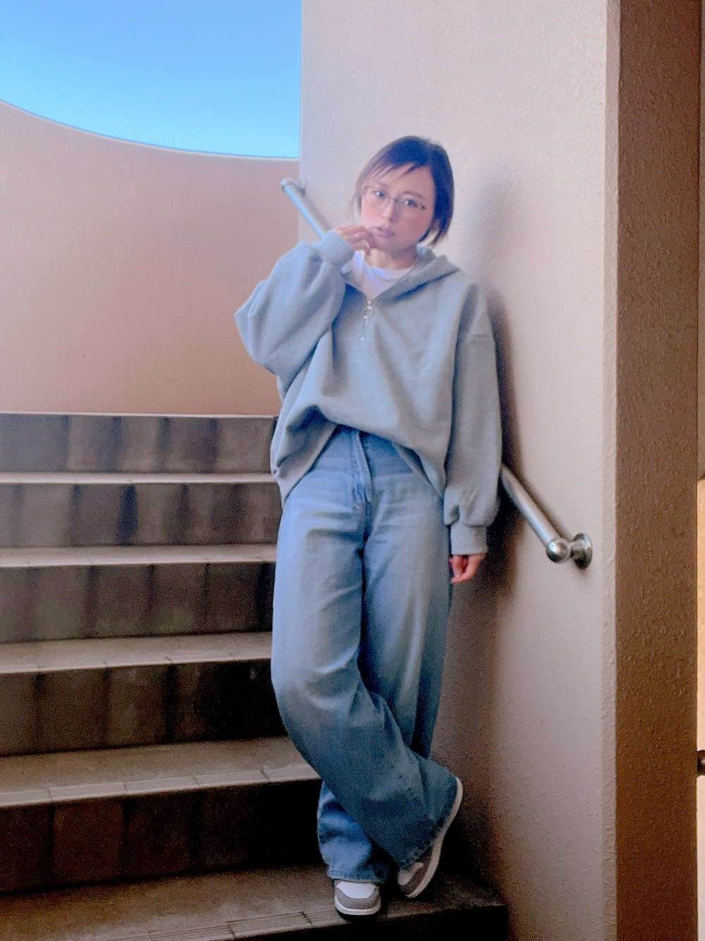 🩶×🩵 淡色コーデ このグレーのトップスは、セトアなのですが、 今回は定番のデニム合わせで、セトアコーデはせず。 アクセはシルバー そして… シルバーのスニーカーを引き続き探していたら… こちらのスニーカーに出会ってしまって🥰 (またまた今回も、シルバーではない𐤔𐤔) お迎えしましたー𐤔𐤔えへへ 届いた時に、底のラバーが汚れていたので、スニーカー用の消しゴムでけしけし__ロ( *´꒳`* ) 靴自体は、状態かなりよかったので、 まるで新品のように(は、言い過ぎか𐤔𐤔でも、ほんとにピカピカで新しいんです😊) 前回はhighタイプ👟でしたが 今回はmidタイプです✨️ このコーデ以降 しばらくは、コーデ上げられそうになくって…(T^T) 年明けて、娘の成人式あたりくらいまでは、無理な予感(T^T) でも、みなさんのとこはおじゃましたり✨️ できればコメもさせていただきます😊