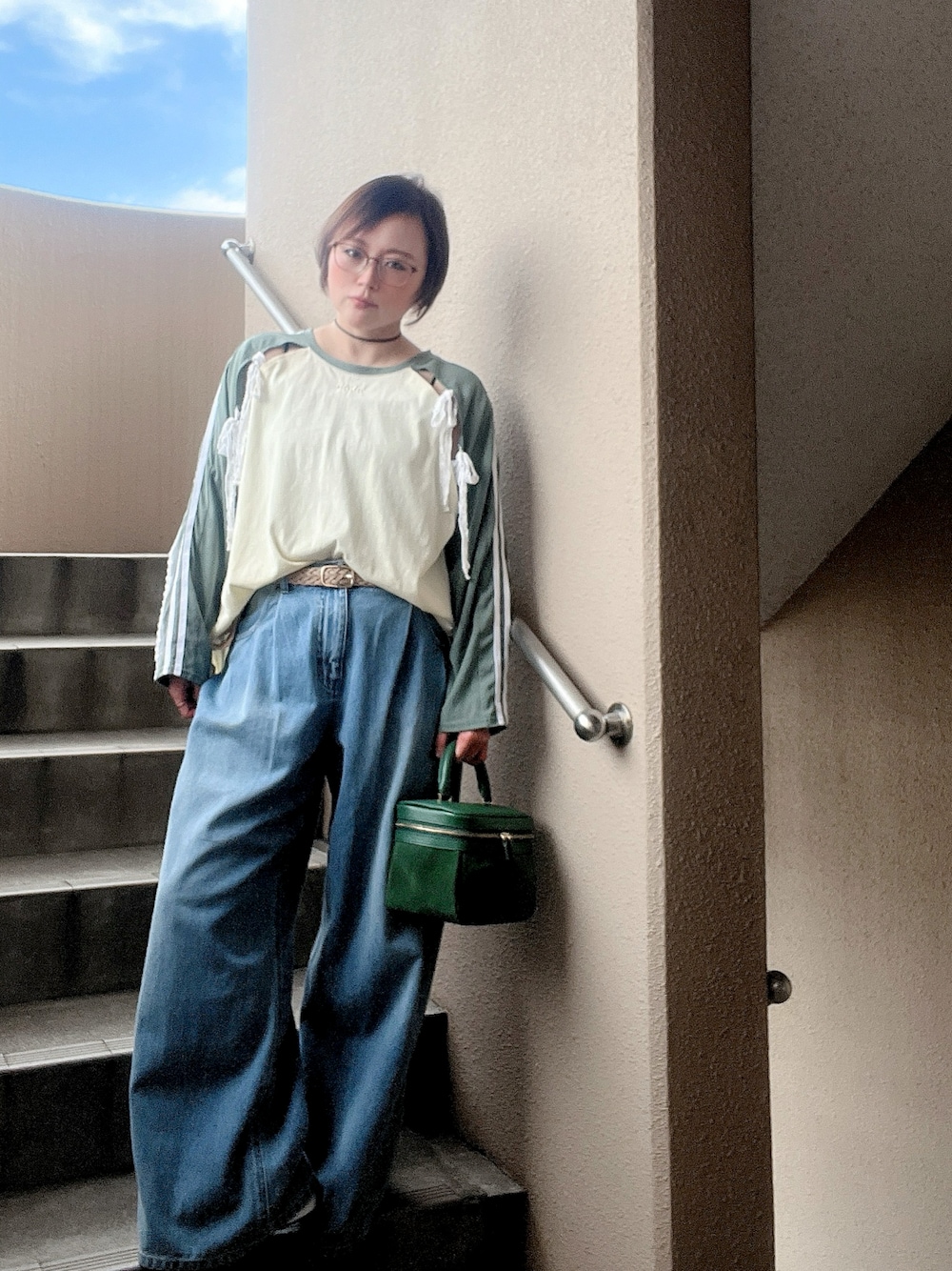 最近、グリーン×ブルー💚💙のコーデが、プチブームなわたし (もちろん、ブラウン×ブルー🤎💙は殿堂入りレベルに大好きです🥰) このロンTは、ZOZOUSEDで1300円 んで、ポイント使って、下取り割引つかったら なんと0円に*⸜(* ॑꒳ ॑* )⸝*㊗️ インナーにベロアのブラトップを合わせたので、ピアスとチョーカーも同素材のものに。 スニーカーにも(安定のほぼ見えやしないだけど…)ちょこんとグリーンです💚 3枚目📷…ネイル、今回はコーヒーブラウンのグラデーション