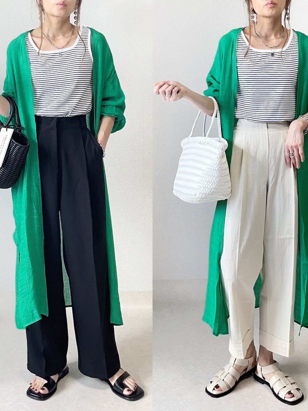 @reedit_official コーデ💕 ナチュラルな風合いの楊柳ガウン♥ 今年は鮮やかグリーンを選びました𓂃 𓈒𓏸 低身長向けのSCサイズが出たの♫ さっそくオーダーしてみたよ𖤐´- テレコリブのタンクトップも開きすぎず、締まりすぎずの首元が良き♪ 細ボーダーも可愛いよねーーー🤤 Mサイズは程よくゆとりもあり、インナーとしていいサイズ◎ ボーダーに合わせて、黒アイテム、白アイテムでコーデしてみたよ- ̗̀ ☺︎☺︎☺︎ ̖́- 黒は締まるし、白は夏っぽくて爽やか🌻 パンツとシューズたちは @tokyogirlsmarket_official マイショップで発売中です♥ ハイライトのTGMからご覧いただけます٩(´ᵕ`๑)و♡
