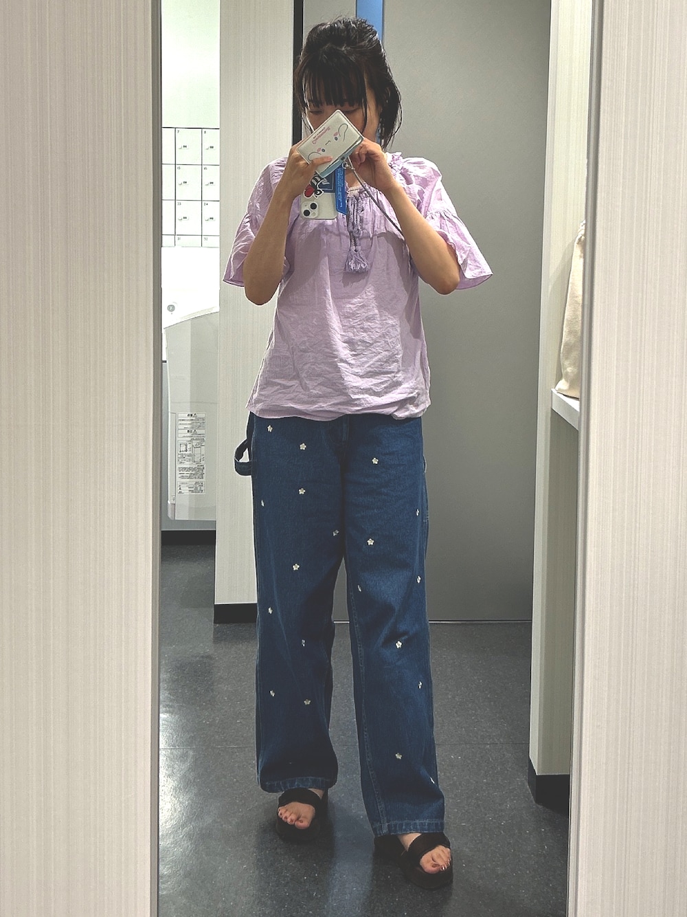 しおりのデニムパンツ「Flower embroideryペインターパンツ」を使ったコーディネート