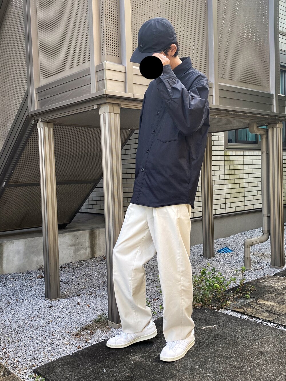 シャツジャケット×ワイドパンツ シンプルなアイテムでまとめたモノトーンコーデ 上は(キャップとジャケット)黒で、 下は(パンツとスニーカー)白で メリハリをつけてきれいめ感を残しました!