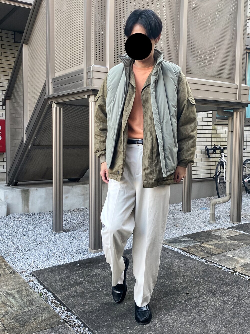 ダウンベスト×ミリタリーブルゾン 古着のミリタリーブルゾンとダウンベストを レイヤードさせた大人カジュアル インナーば差し色にオレンジのスウェットを パンツはスッキリとオフホワイトを合わせました!