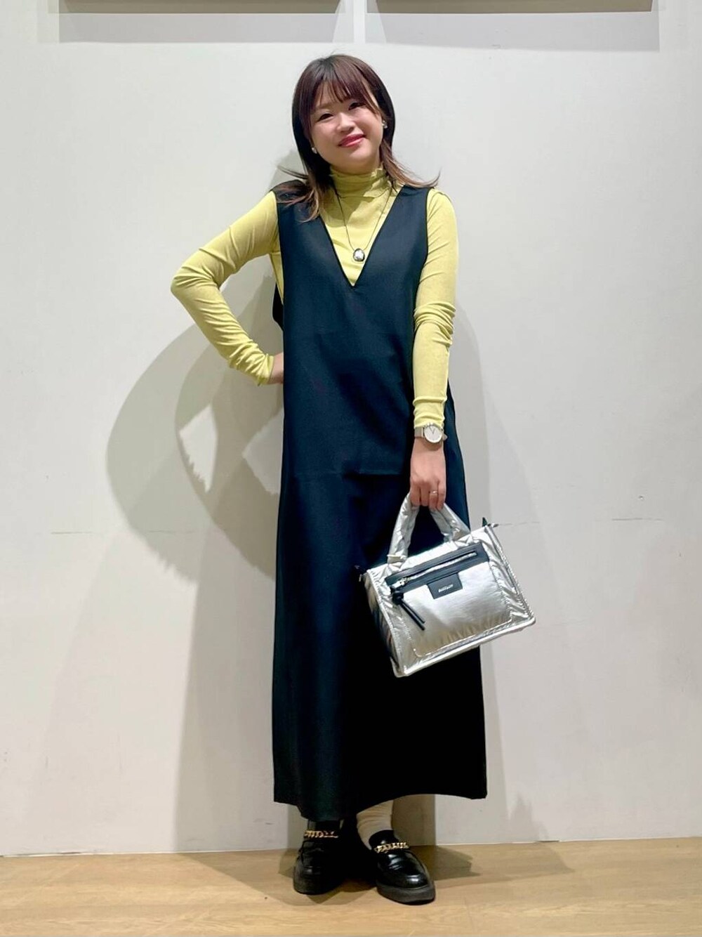 🥺❤️ お好みのインナー何でも合っちゃう、 1枚でオシャレ完成のVネックジャンパスカート✌🏽 Iラインのシルエットが大人っぽく、 マイナス3キロ痩せて見える着痩せワンピ💕