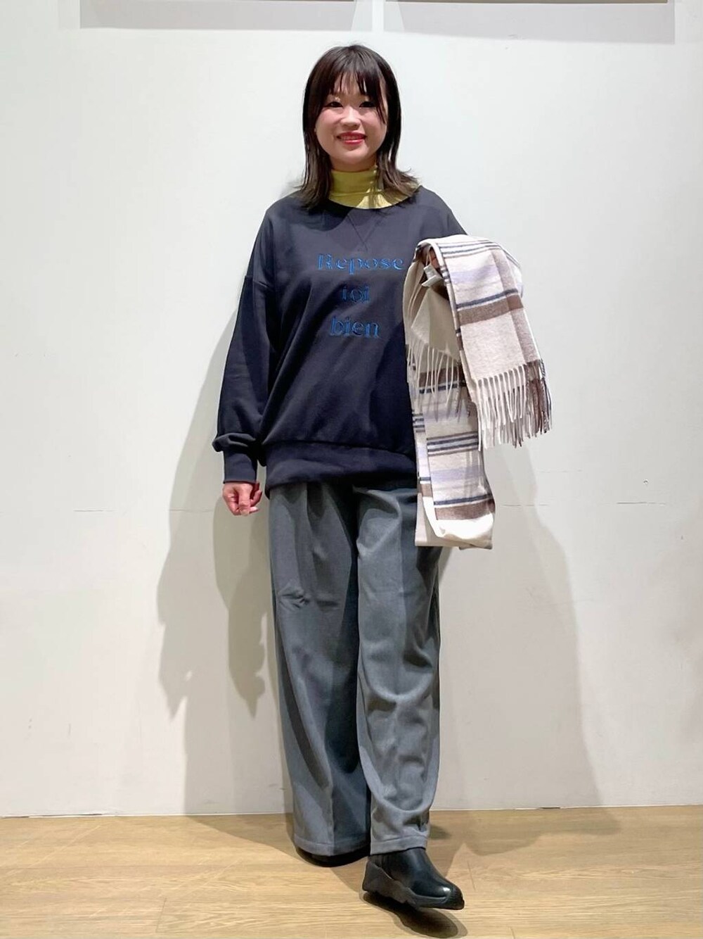 akari(BAYFLOW モレラ岐阜)のマフラー「[ウール100%であったか]ウールチェックマフラー」を使ったコーディネート